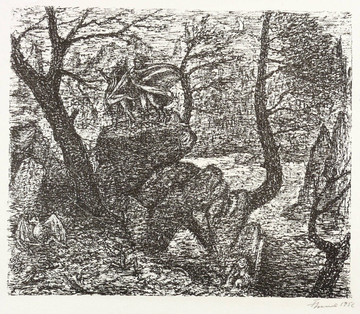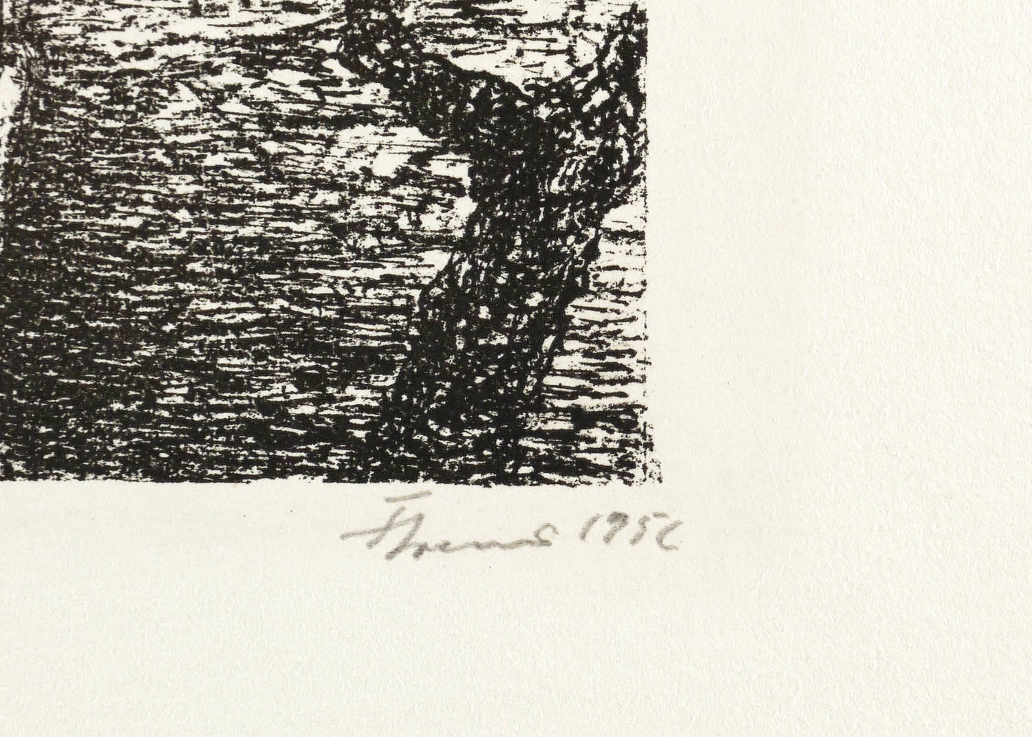1956. Lithografie / Pinsel-, Kreide- & Federlithografie, in Schwarz, auf leichtem hellchamois Velin. – Originale Künstlergrafik, von Fritz Cremer. – Auflage 50 Exemplare. – 21,8 x 25,5 cm (Darstellung / Druckbild), 33 x 45 cm (Blatt).
