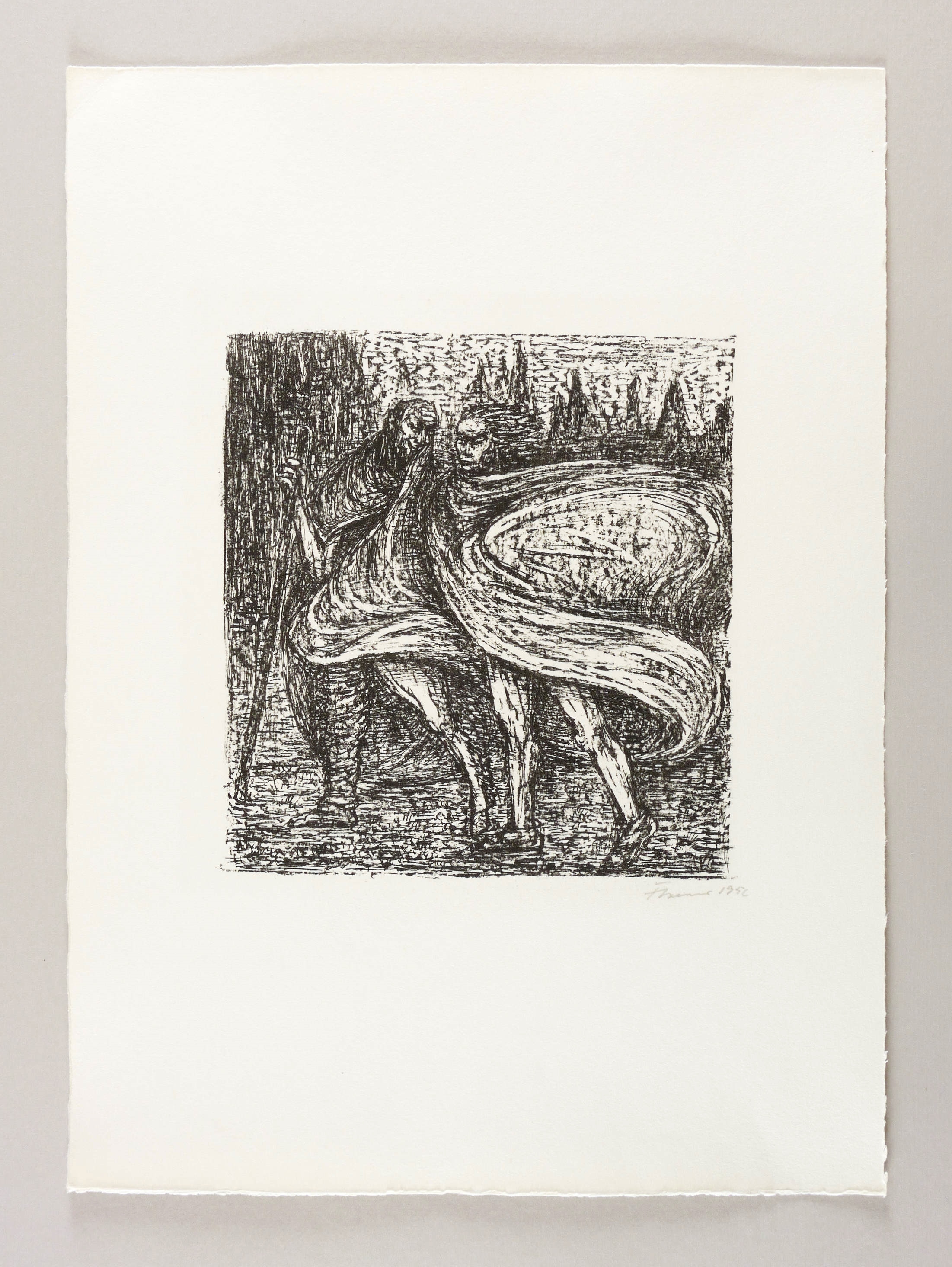 Gredig 47. – Rechts unten in Bleistift signiert und datiert: ″FCremer 1956″. – Aus der lithografierten Folge zu Johann Wolfgang von Goethe ″Faust″. – Sehr guter Zustand.