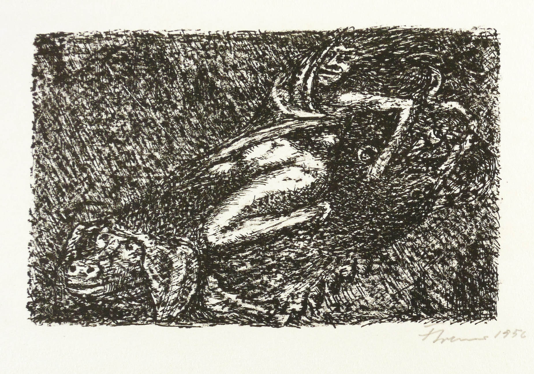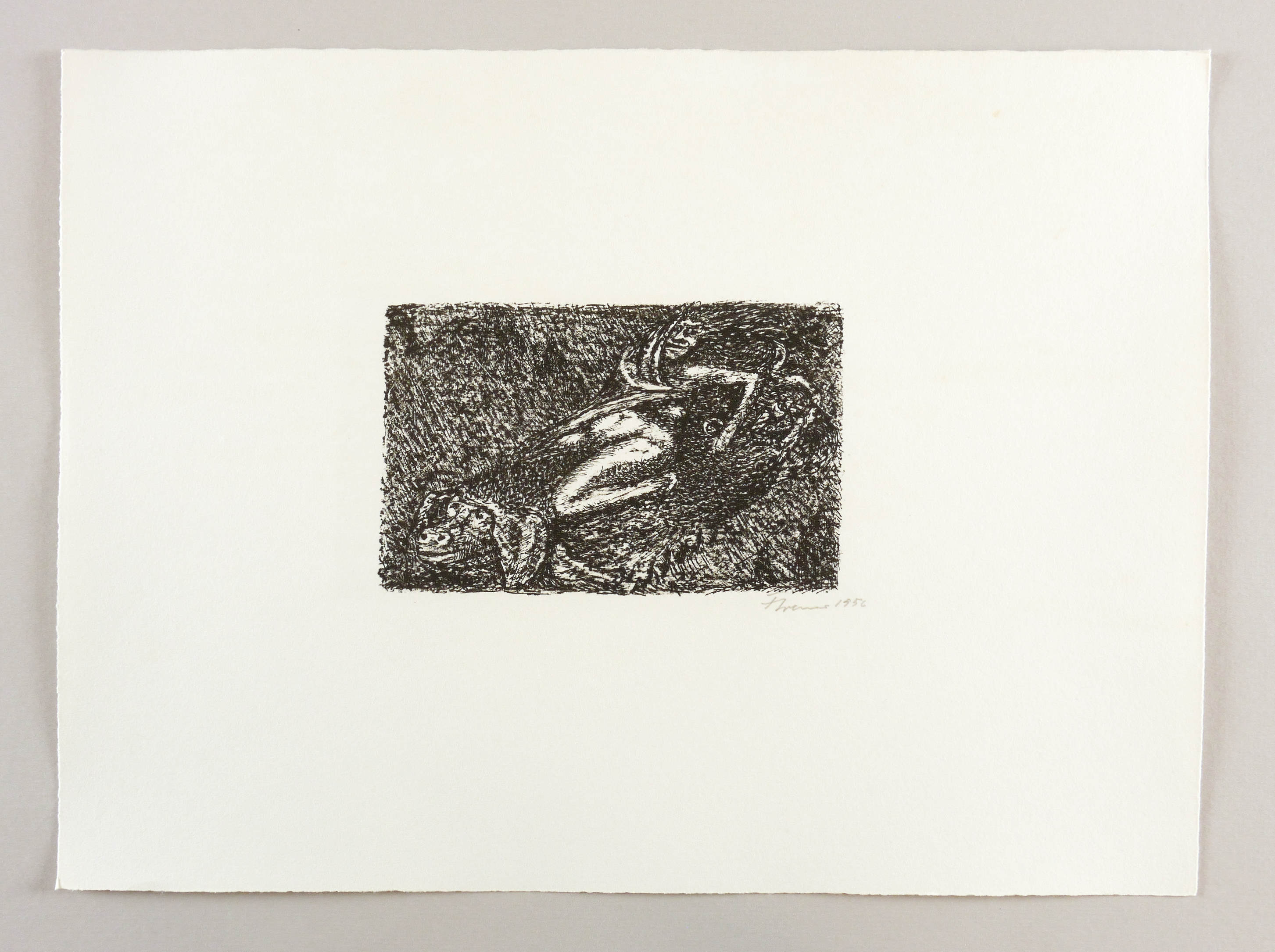 1956. Lithografie / Kreide- & Federlithografie, in Schwarz, auf leichtem hellchamois Velin. – Originale Künstlergrafik, von Fritz Cremer. – Auflage 50 Exemplare. – 11,2 x 17,7 cm (Darstellung / Druckbild), 33 x 44 cm (Blatt).