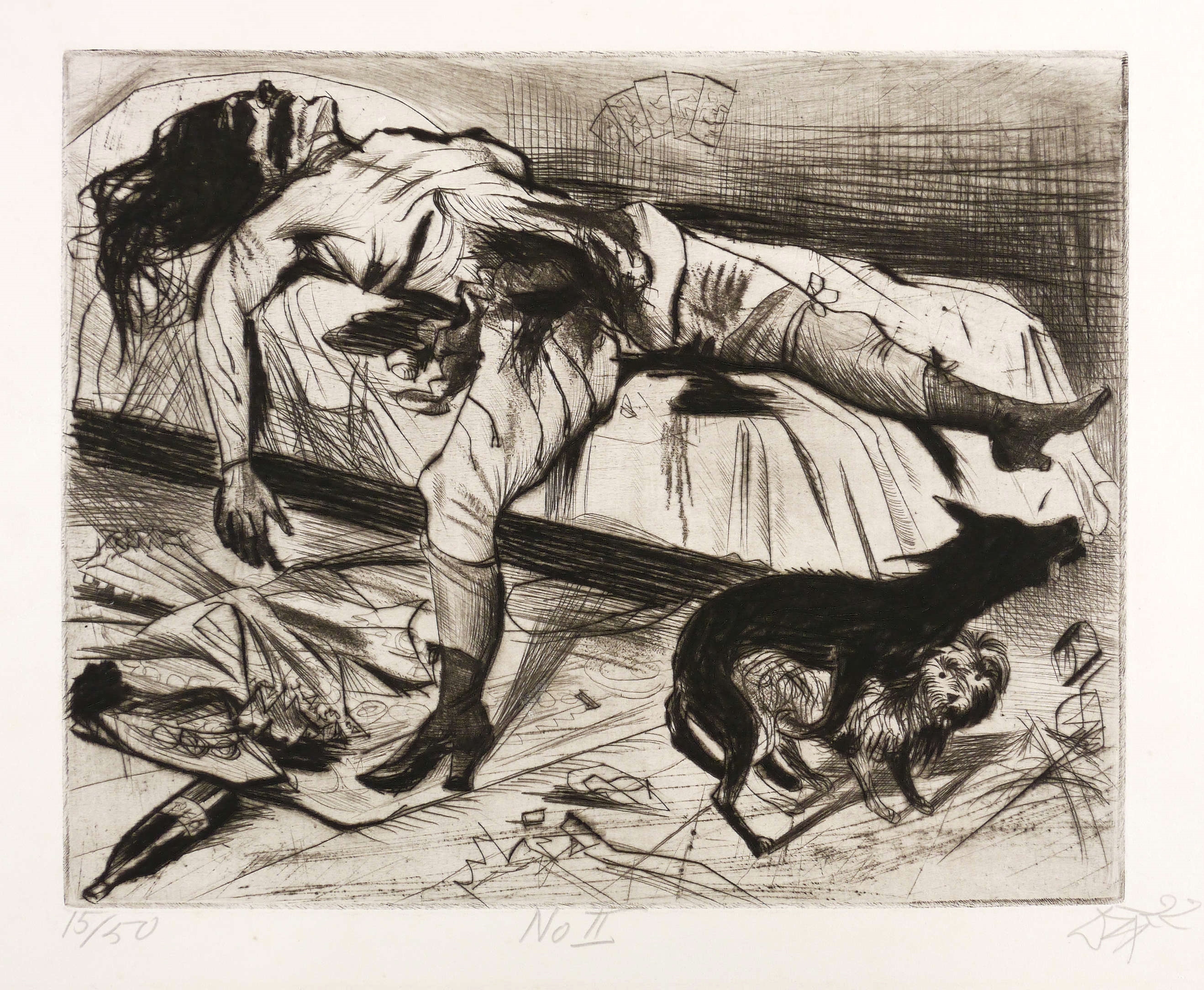 1922. Radierung / Kaltnadel, mit Plattenton, in Schwarz, auf kräftigem hellgelbem Velin. – Originale Künstlergrafik, von Otto Dix. – Auflage Exemplar Nr. 15/50. – 28,1 x 34,8 cm (Darstellung / Platte), 36 x 47 cm (Blatt).