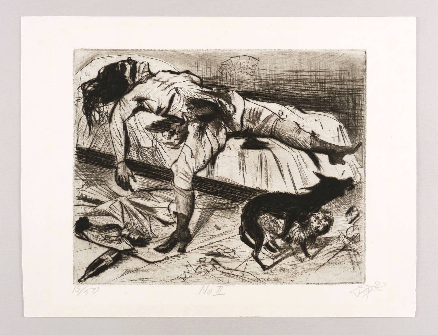 Karsch 44 II. – Rechts unten in Bleistift signiert und datiert: ″DIX 22″. Links Auflagenbezeihcnung und Folgen-Nr.: ″15/50 / II″. Verso Sammlerstempel Grafikständer in Rot. – Blatt aus der Folge ″Tod und Auferstehung″. Zweiter Zustand der Platte mit der Schrägschraffur unter dem Kopfende des Bettes. – Schönes Exemplar. Rückseitig im oberen Blattrand leichte Montagereste. Sehr guter Zustand.