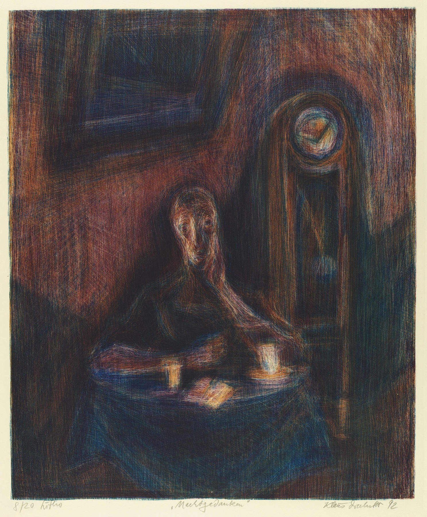 1992. Farblithografie, auf gelblichem Hahnemühle-Bütten. – Originale Künstlergrafik, von Klaus Drechsler. – Auflage Exemplar Nr. 8/20. – 47,5 x 39,7 cm (Darstellung), 67 x 54 cm (Blatt).