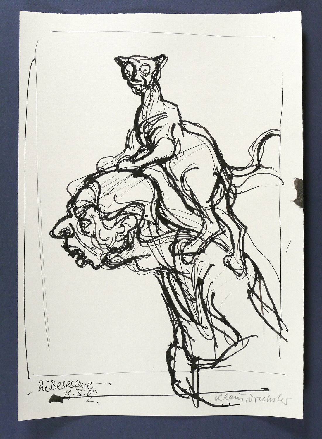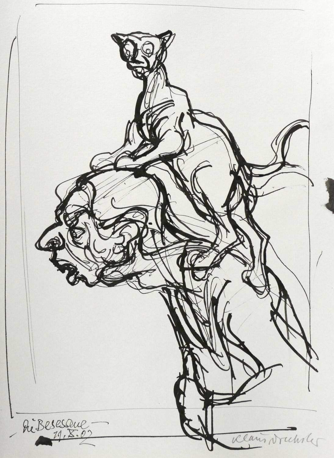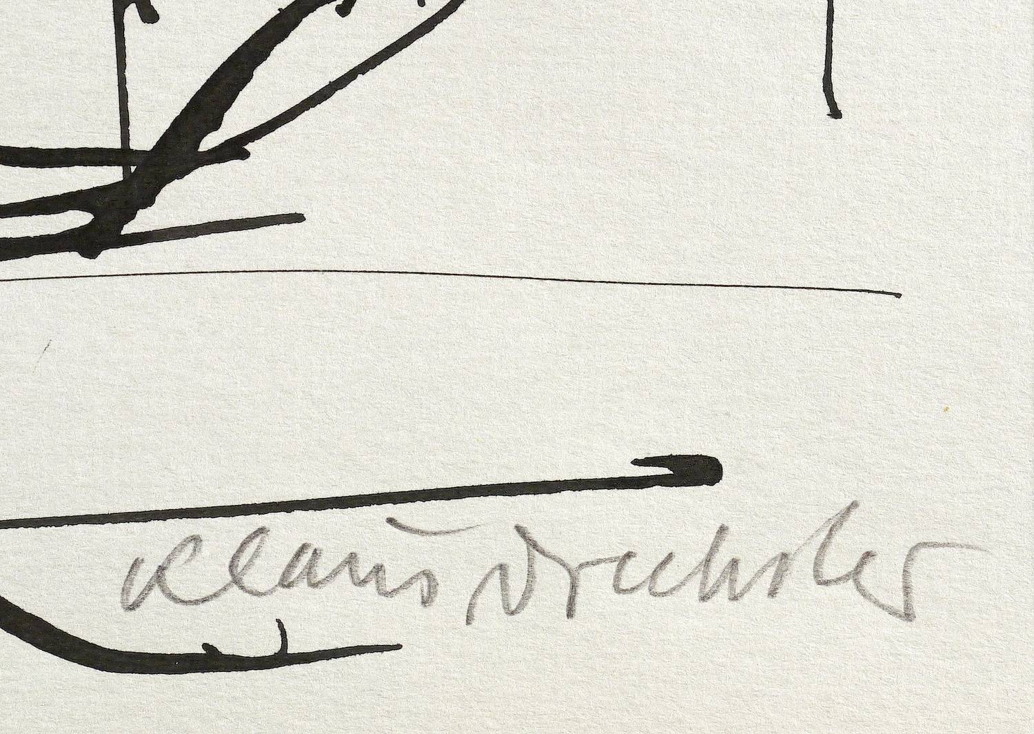 2002. Zeichnung / Federzeichnung, in schwarzer Tusche, auf hellgrauem Maschinenbütten. – Originale Künstlergrafik, von Klaus Drechsler. – Unikat. – 37,7 x 26,5 cm (Darstellung / Blatt).