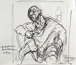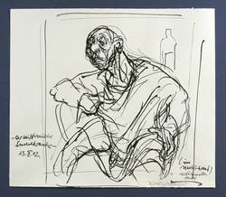 Rechts unten in Bleistift signiert. Links dazu in Tusche bezeichnet: ″Der mißtrauische Suchtkranke (im Nachthemd, verstümmelte Hand)″. – Leichte Knickspur im linken Randbereich. Sonst guter Zustand.