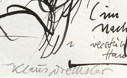 2002. Zeichnung / Federzeichnung, in schwarzer Tusche, auf hellgrauem Maschinenbütten. – Originale Künstlergrafik, von Klaus Drechsler. – Unikat. – 32,7 x 37,7 cm (Darstellung / Blatt).