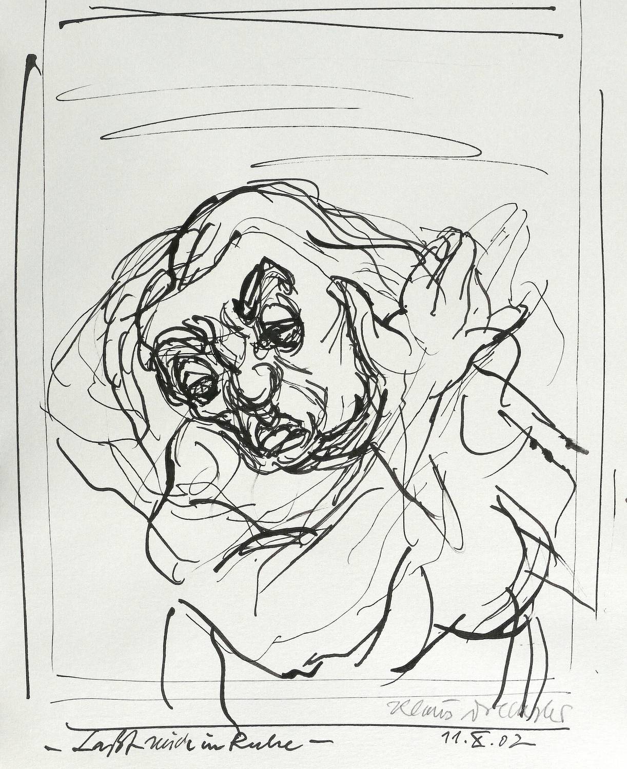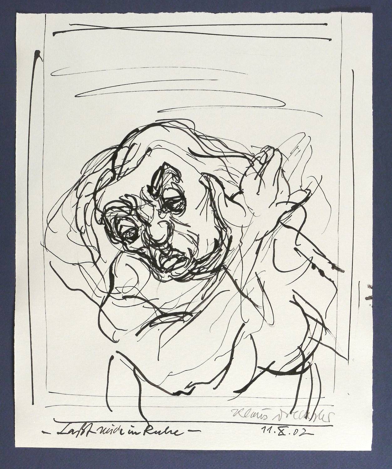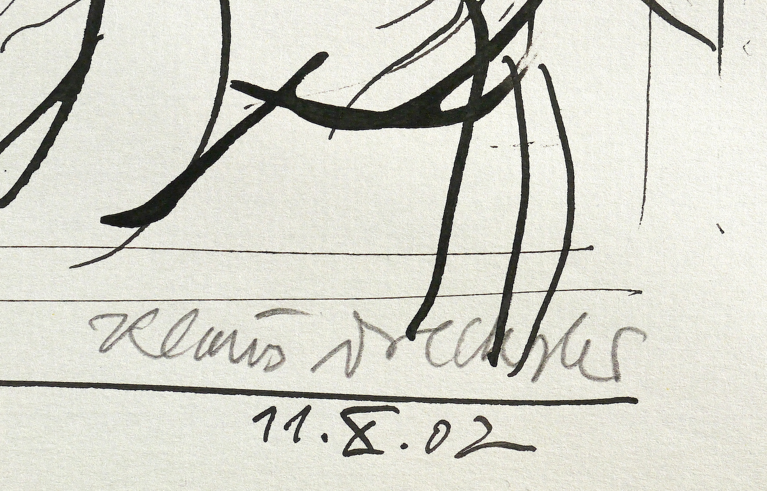 2002. Zeichnung / Federzeichnung, in schwarzer Tusche, auf hellgrauem Maschinenbütten. – Originale Künstlergrafik, von Klaus Drechsler. – Unikat. – 32,5 x 26,7 cm (Darstellung / Blatt).