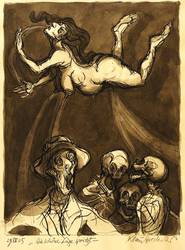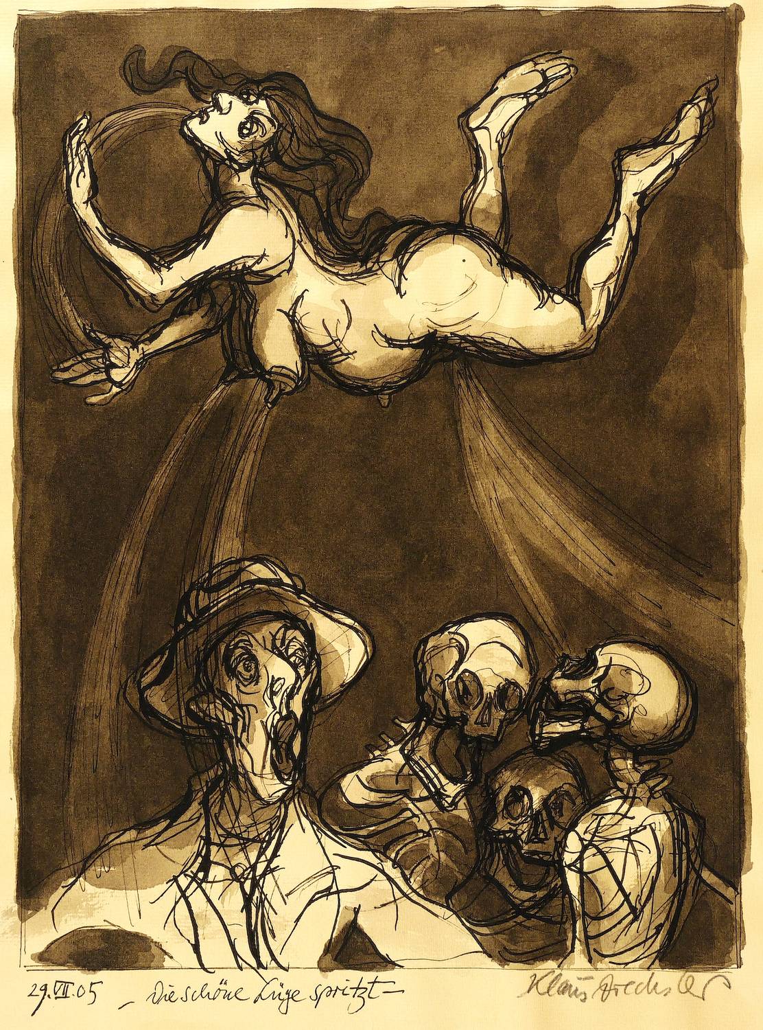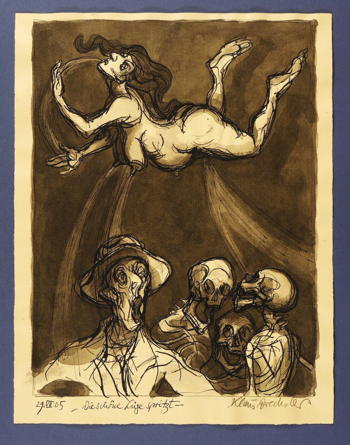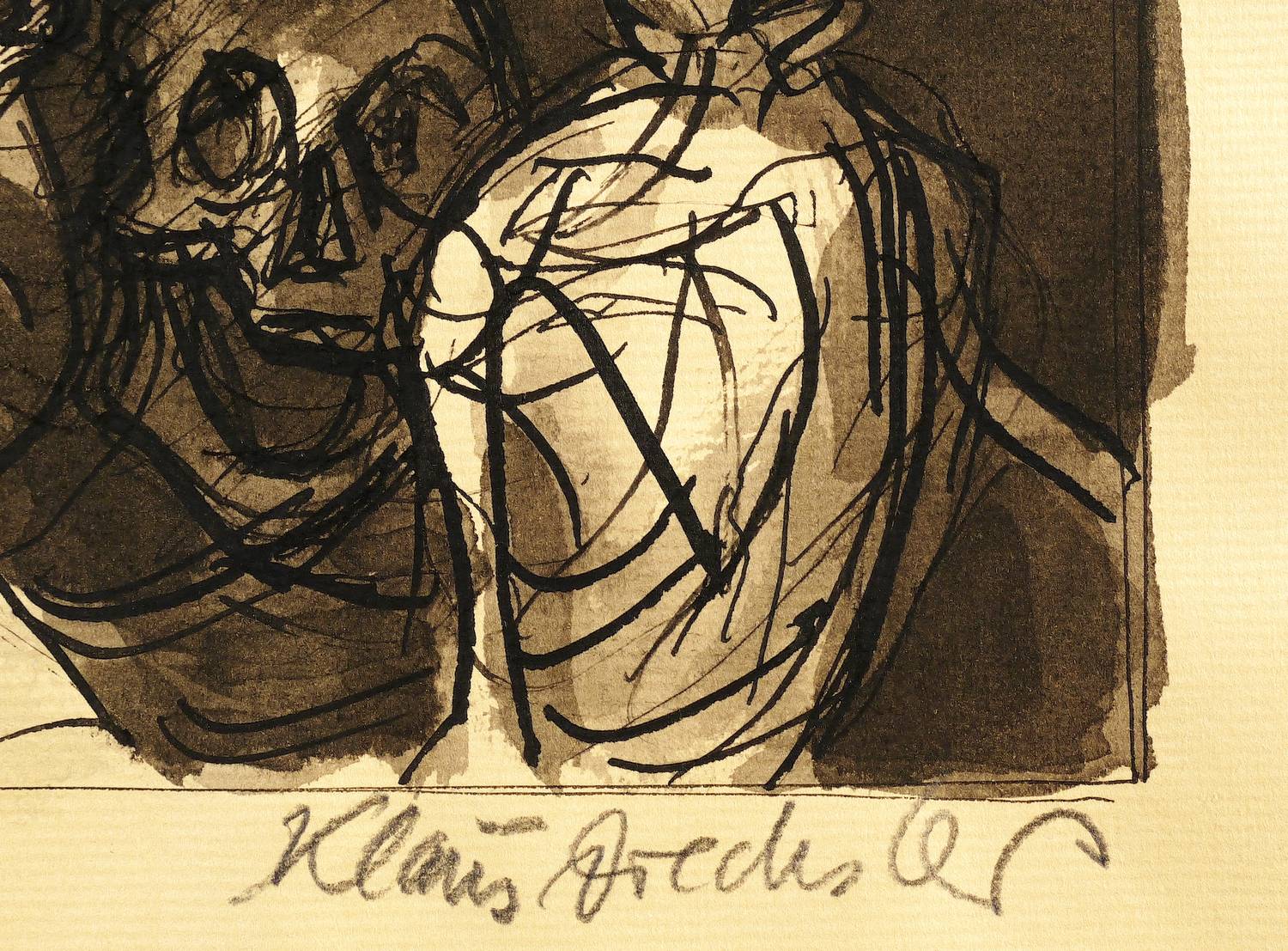 2005. Zeichnung / Federzeichnung, in Tusche laviert, auf hellorangem Maschinenbütten. – Originale Künstlergrafik, von Klaus Drechsler. – Unikat. – 39,0 x 29,5 cm (Darstellung), 43 x 34 cm (Blatt).