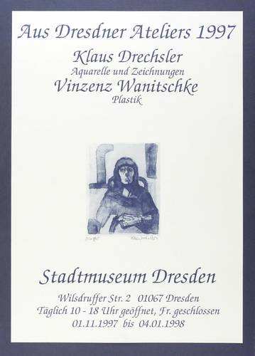 Rechts unten in Bleistift signiert. Links Auflagenbezeichnung und Technik. Diverse Inschriften. – Originalgrafisches Künstler-Plakat zur Ausstellung des Künstlers in der Reihe ″Aus Dresdner Ateliers″ im Stadtmuseum Dresden 1997 mit Klaus Drechsler und Vinzenz Wanitschke. – Tadellos. Sehr guter Erhaltungszustand.