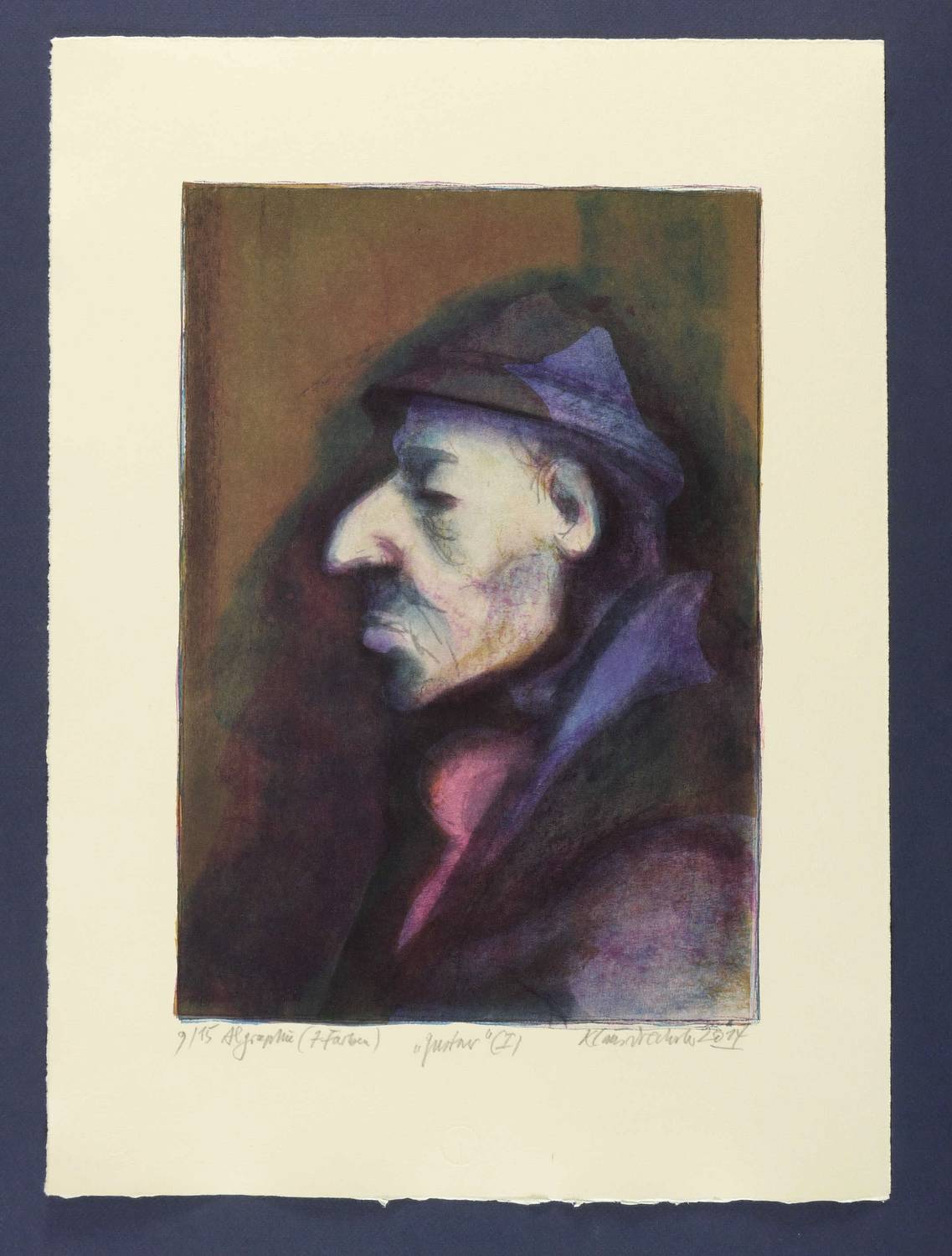 2014. Farbalgrafie / Pinselalgrafie, in 7 Farben, auf schwerem gelbem Hahnemühle-Bütten. – Originale Künstlergrafik, von Klaus Drechsler. – Auflage Exemplar Nr. 9/15. – 38,8 x 27,0 cm (Darstellung / Druckbild), 53,5 x 39 cm (Blatt).