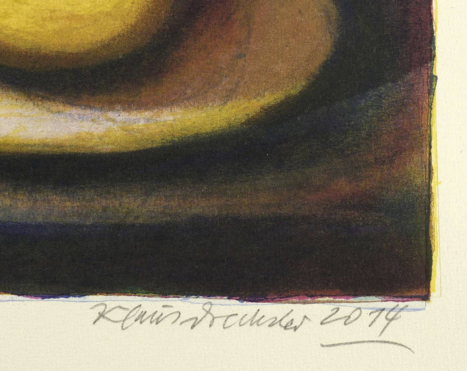 2014. Farbalgrafie / Pinselalgrafie, in 7 Farben, auf schwerem gelbem Hahnemühle-Bütten. – Originale Künstlergrafik, von Klaus Drechsler. – Auflage Exemplar Nr. 7/15. – 35,0 x 40,5 cm (Darstellung / Druckbild), 44,5 x 54,5 cm (Blatt).