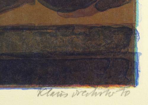 2010. Farbalgrafie / Pinselalgrafie, in 7 Farben, auf schwerem gelbem Hahnemühle-Bütten. – Originale Künstlergrafik, von Klaus Drechsler. – Künstlerexemplar (e.a.) Nr. 1/5. – 26,0 x 49,8 cm (Darstellung / Druckbild), 36,5 x 63,5 cm (Blatt).
