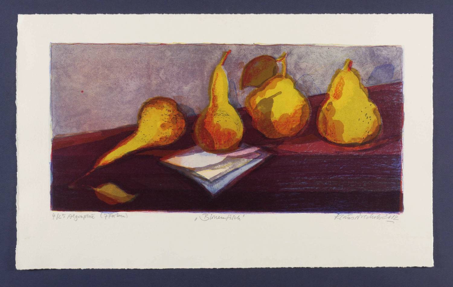 2012. Farbalgrafie / Pinselalgrafie, in 7 Farben, auf schwerem hellchamois Bütten. – Originale Künstlergrafik, von Klaus Drechsler. – Auflage Exemplar Nr. 4/25. – 24,9 x 51,5 cm (Darstellung), 37 x 61 cm (Blatt).