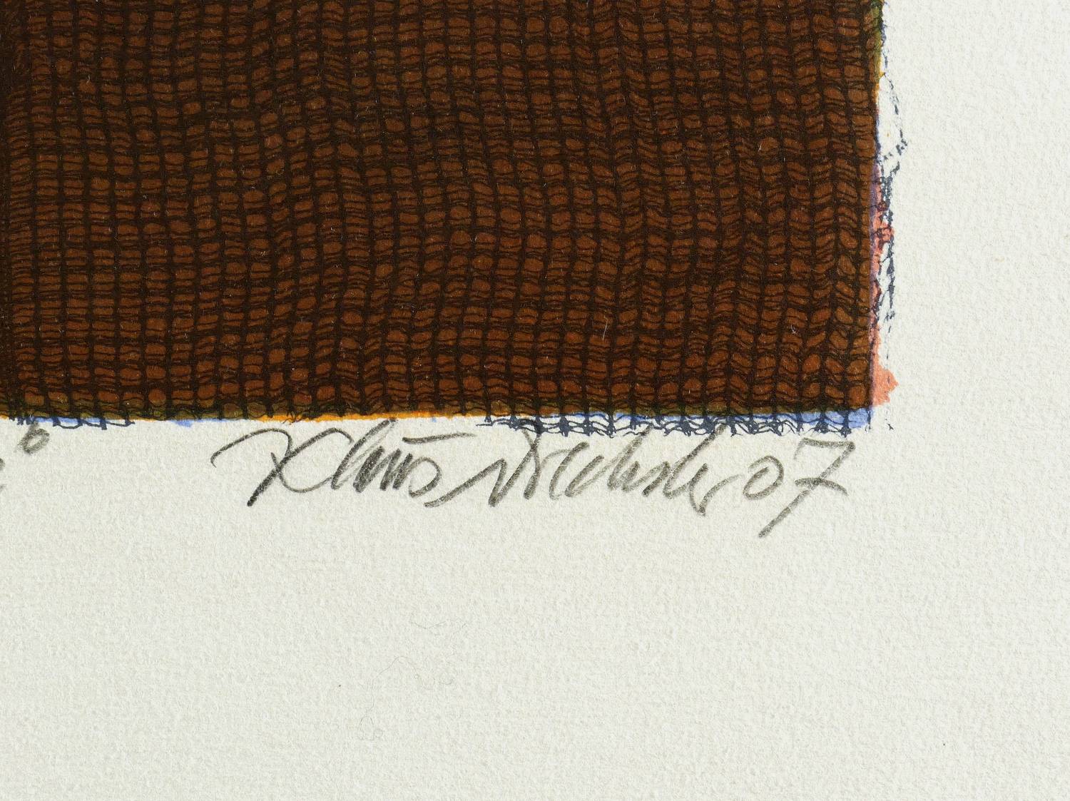 Sämtliche Blätter rechts unten in Bleistift signiert und datiert. Links Auflagenbezeichnung, mittig Titel. Impressum ebenfalls in Bleistift signiert und mit Auflagenbezeichnung versehen. – Originalgrafisches Mappenwerk mit 5 von Klaus Drechsler selbst gedruckten Farbalgrafien zu Gedichten von Dieter Hoffmann, Mappengestaltung Kornelia Lindner, Radebeul. – Vollständig mit Titelblatt, Gedichten und Nachbemerkung. In originaler Kassette. Sehr guter Zustand.