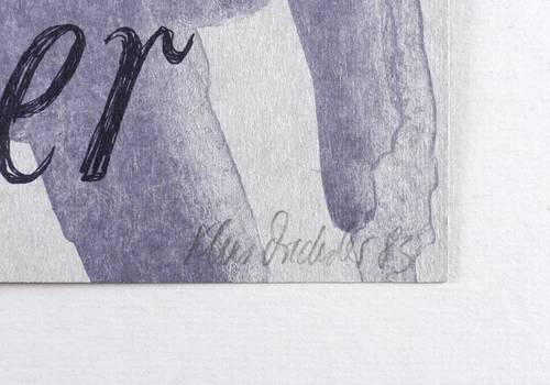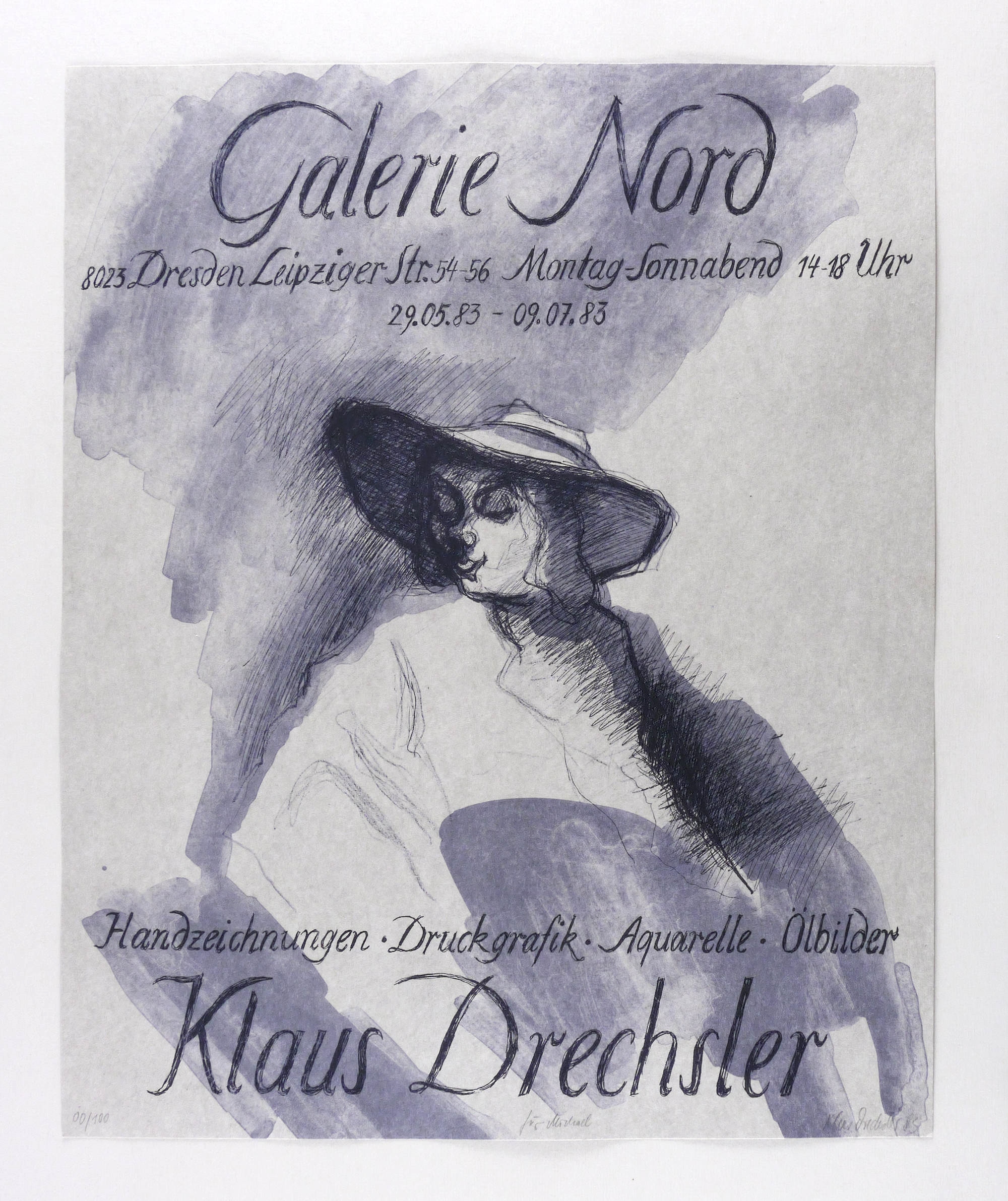 Rechts unten in Bleistift signiert und datiert: ″Klaus Drechsler 83″. Links Auflagenbezeichnung: ″00/100″. – Originalgrafisches Künstler-Plakat zur Ausstellung ″Klaus Drechsler. Handzeichnungen, Druckgrafik, Aquarelle, Ölbilder″ in der Galerie Nord in Dresden 29. Mai - 9. Juli 1983. – Tadellos. Sehr guter Erhaltungszustand.