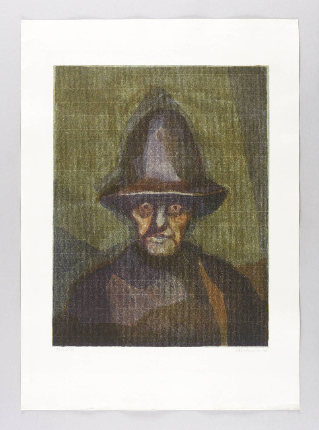 1980. Farblithografie / Pinsellithografie, in 6 Farben, auf festem hellchamois Maschinenbütten. – Originale Künstlergrafik, von Klaus Drechsler. – Druckerexemplar. – 50,2 x 38,5 cm (Darstellung / Druckbild), 69 x 50 cm (Blatt).