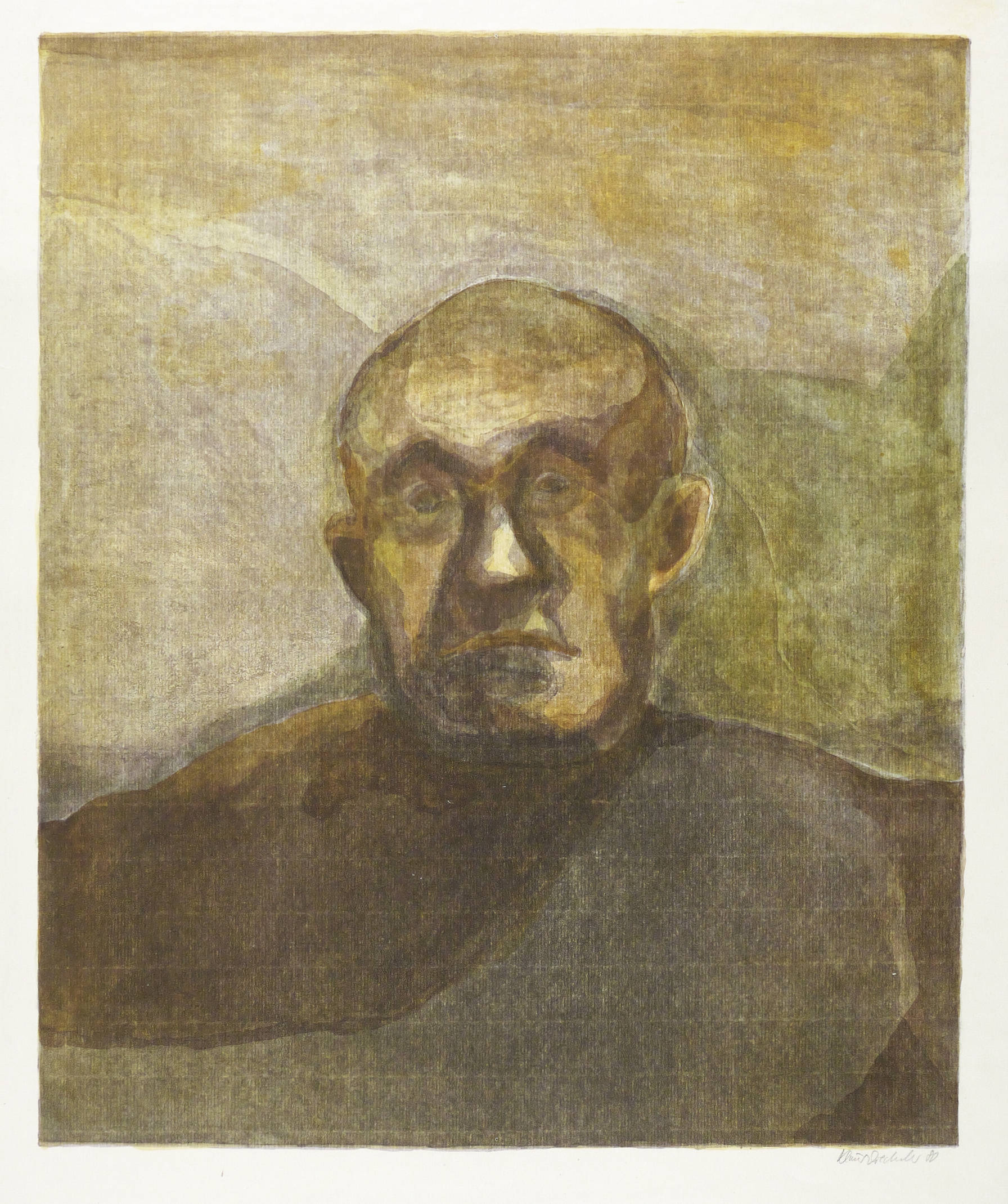 1980. Farblithografie / Pinsellithografie, in 5 Farben, auf festem hellchamois Maschinenbütten. – Originale Künstlergrafik, von Klaus Drechsler. – Druckerexemplar. – 50,5 x 42,0 cm (Darstellung / Druckbild), 65 x 50 cm (Blatt).