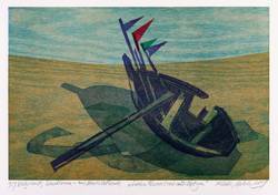 Rechts unten in Bleistift signiert und datiert: ″Klaus Drechsler 2019″. Links Auflagen- und Technikbezeichnung: ″9/9 Holzschnitt, Schablonen - und Materialdruck″. Mittig Titel: ″Leckes Fischerboot mit Netzen″. Trockenstempel der Grafikwerkstatt Dresden. – Sehr guter Zustand.