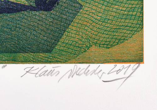 2019. Farbholzschnitt, mit Pochoir & Materialdruck, in 5 Farben, auf weißem Zerkall. – Originale Künstlergrafik, von Klaus Drechsler. – Auflage Exemplar Nr. 9/9. – 30,0 x 44,9 cm (Darstellung / Druckbild), 39 x 54 cm (Blatt).