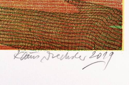 2019. Farbholzschnitt, mit Materialdruck, in 5 Farben, auf weißem Zerkall. – Originale Künstlergrafik, von Klaus Drechsler. – Auflage Exemplar Nr. 8/9. – 21,5 x 45,0 cm (Darstellung / Druckbild), 32 x 54 cm (Blatt).