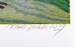 2019. Farbholzschnitt, mit Pochoir & Materialdruck, in 5 Farben, auf weißem Zerkall. – Originale Künstlergrafik, von Klaus Drechsler. – Auflage Exemplar Nr. 2/8. – 21,5 x 45,0 cm (Darstellung / Druckbild), 33 x 54 cm (Blatt).