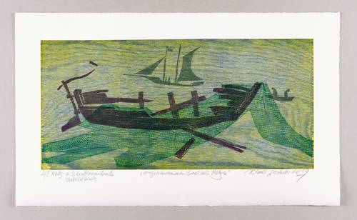 Rechts unten in Bleistift signiert und datiert: ″Klaus Drechsler 2019″. Links Auflagen- und Technikbezeichnung: ″2/8 Holz- u. Schablonendruck / Materialdruck″. Mittig Titel: ″Angeschwemmtes Boot mit Netzen″. Trockenstempel der Grafikwerkstatt Dresden. – Sehr guter Zustand.