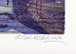 2022. Farbholzschnitt, in 4 Farben, auf weißem Zerkall. – Originale Künstlergrafik, von Klaus Drechsler. – Auflage Exemplar Nr. 79. – 24,7 x 29,8 cm (Darstellung / Druckbild), 33 x 39 cm (Blatt).