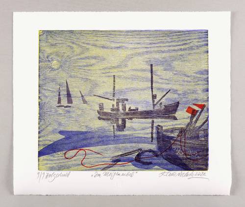 Rechts unten in Bleistift signiert und datiert: ″Klaus Drechsler 2022″. Links Auflagen- und Technikbezeichnung: ″9/9 Holzschnitt″. Mittig Titel: ″Im Morgennebel″. Trockenstempel der Grafikwerkstatt Dresden. – Sehr guter Zustand.