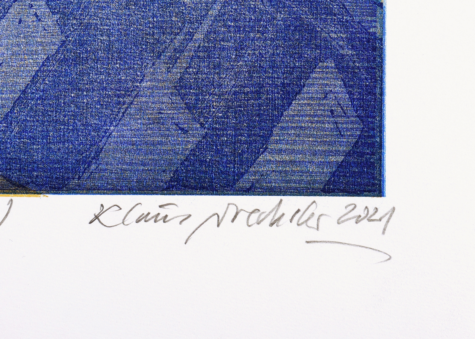 2021. Farbholzschnitt, mit Pochoir, in 6 Farben, auf weißem Zerkall. – Originale Künstlergrafik, von Klaus Drechsler. – Auflage Exemplar Nr. 1/9. – 32,4 x 31,5 cm (Darstellung / Druckbild), 43 x 39 cm (Blatt).