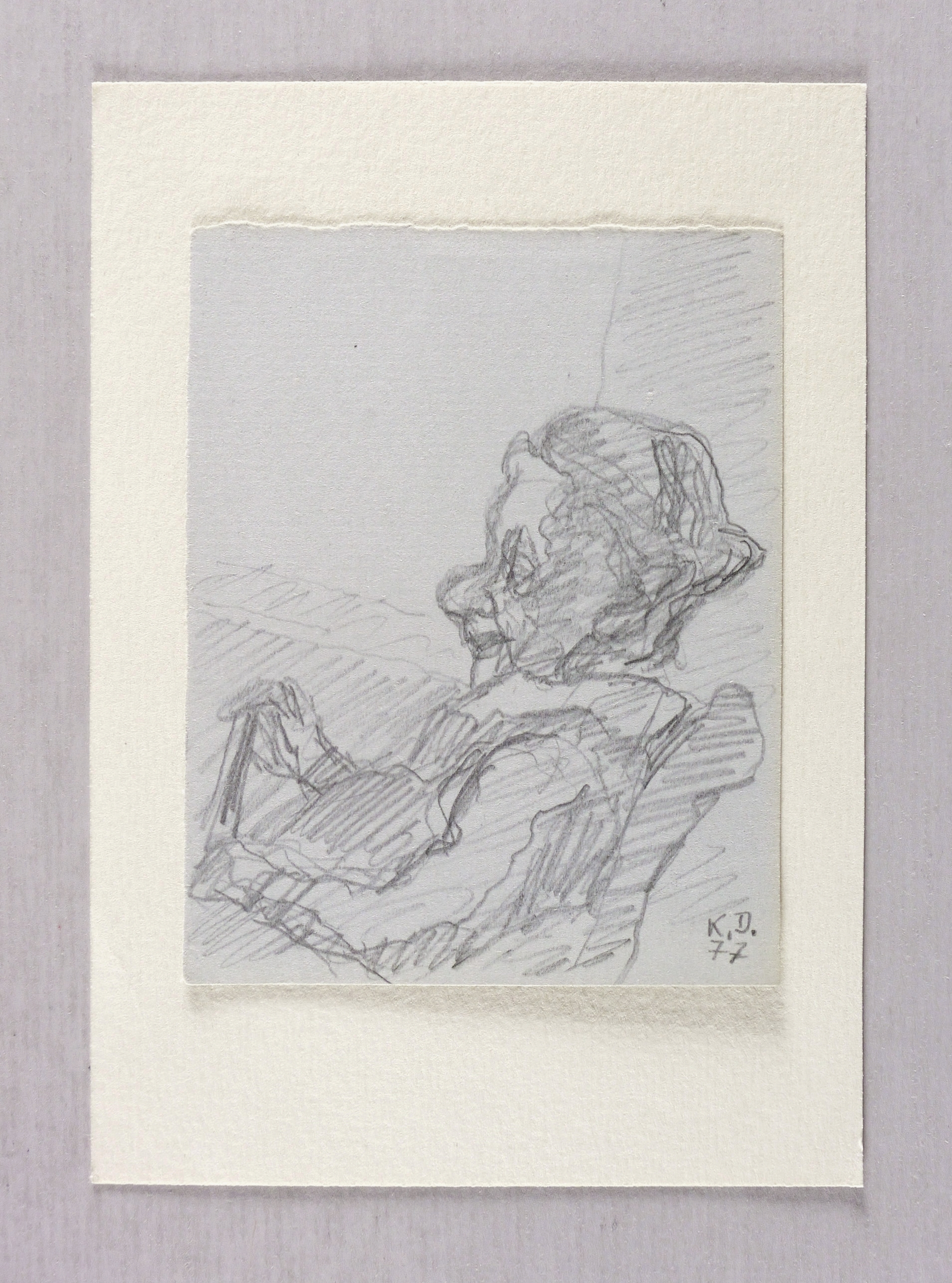 1977. Zeichnung / Bleistiftzeichnung, auf hellgrau getöntem Maschinenbütten. – Originale Künstlergrafik, von Klaus Drechsler. – Unikat. – 10,8 x 8,4 cm (Darstellung / Blatt), 16 x 11 cm (Trägerkarton).