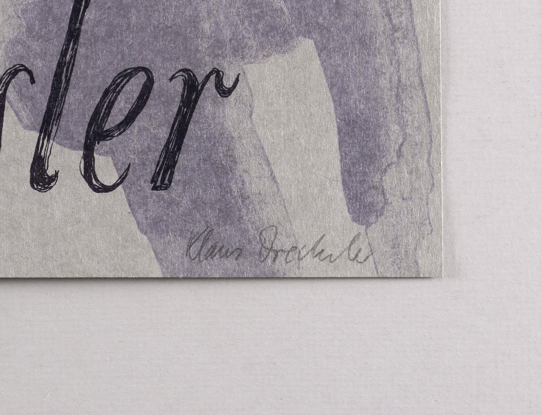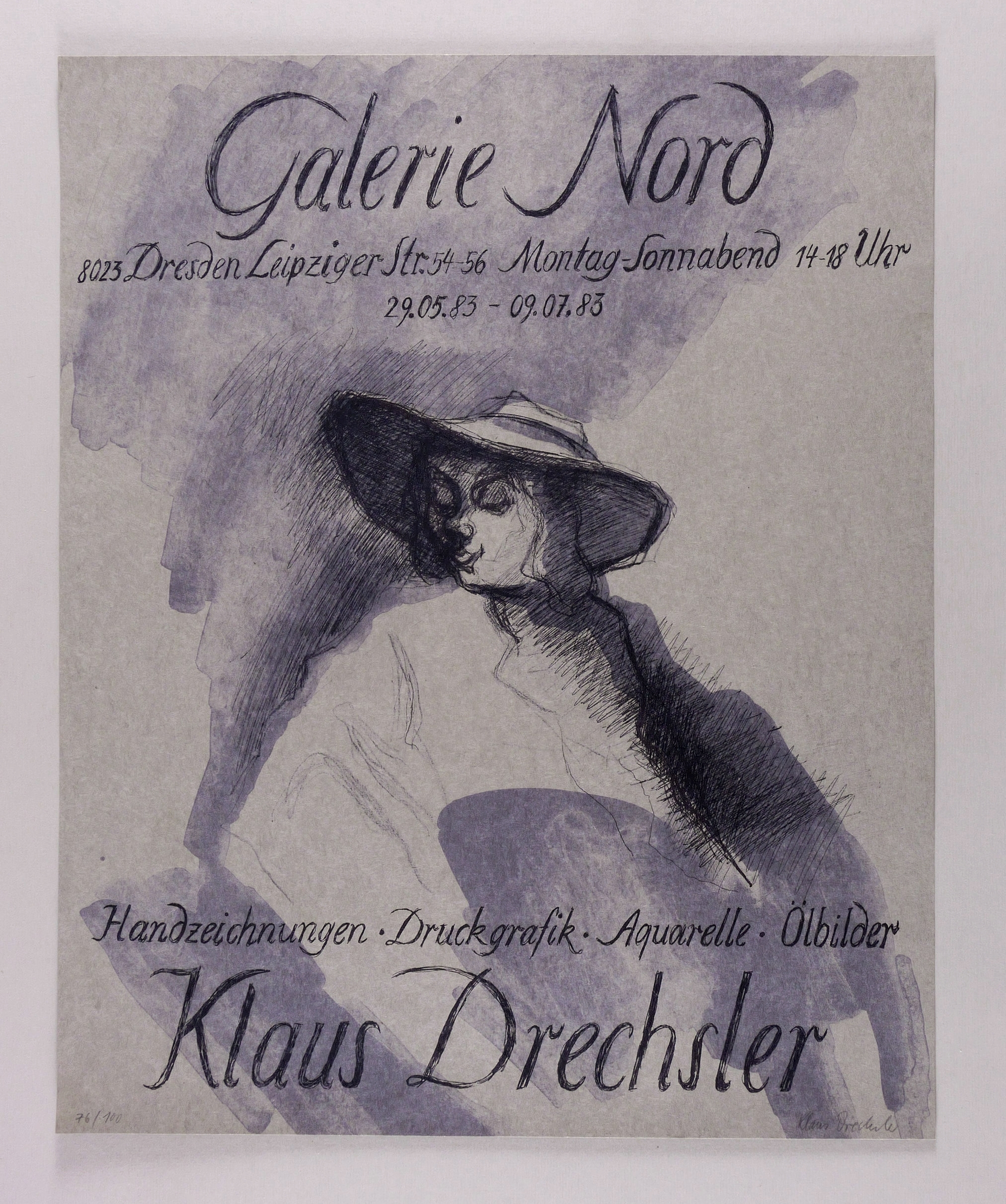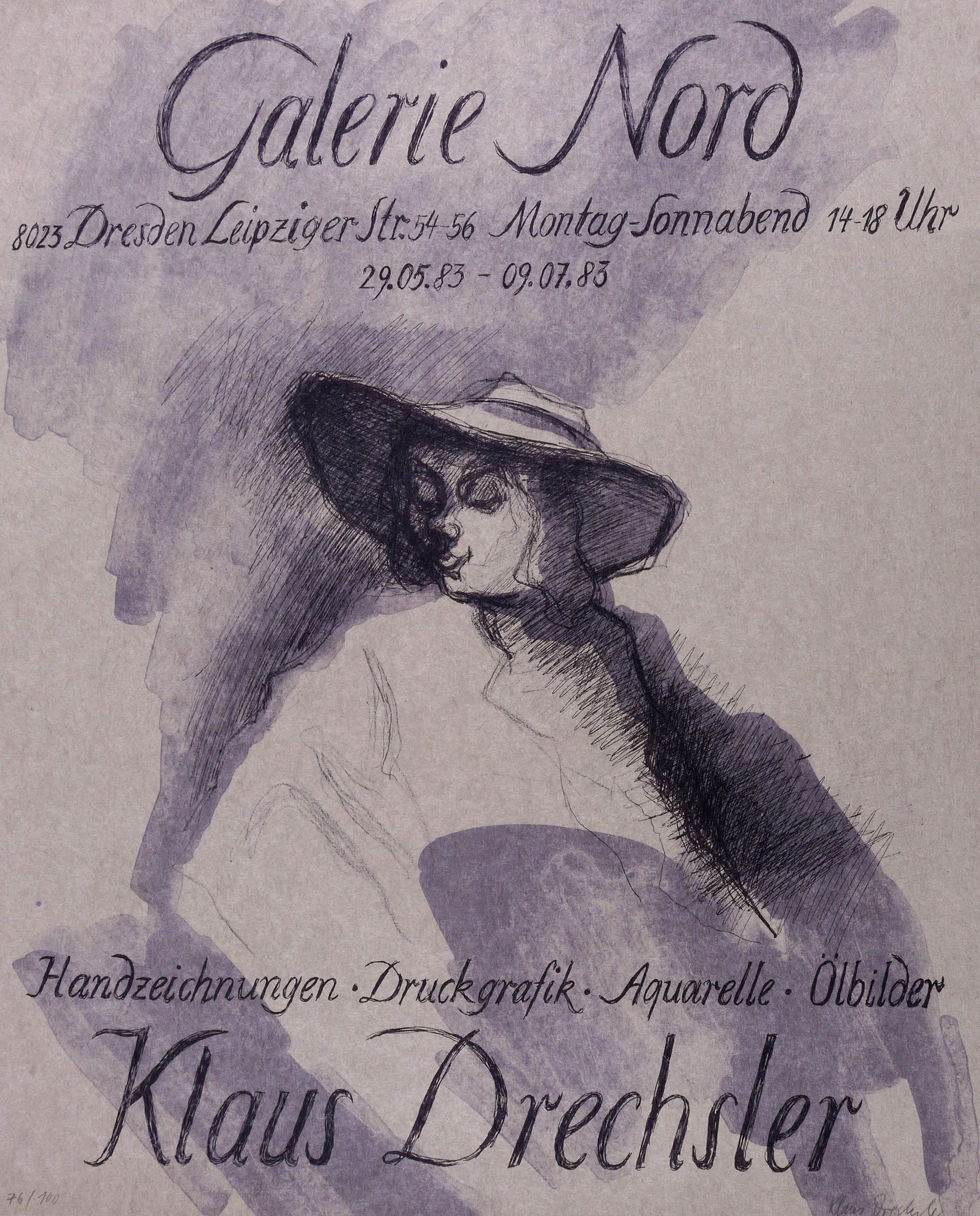 Rechts unten in Bleistift signiert: ″Klaus Drechsler″. Links Auflagenbezeichnung: ″76/100″. – Originalgrafisches Künstler-Plakat zur Ausstellung ″Klaus Drechsler. Handzeichnungen, Druckgrafik, Aquarelle, Ölbilder″ in der Galerie Nord in Dresden 29. Mai - 9. Juli 1983. – Provenienz: Sammlung Gerlint Söder und Erhard Frommhold, Dresden. – Tadellos. Sehr guter Zustand.