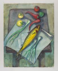 Drechsler, Klaus. – „Abstelltisch mit Räucherfisch, Tomaten, Paprika”.