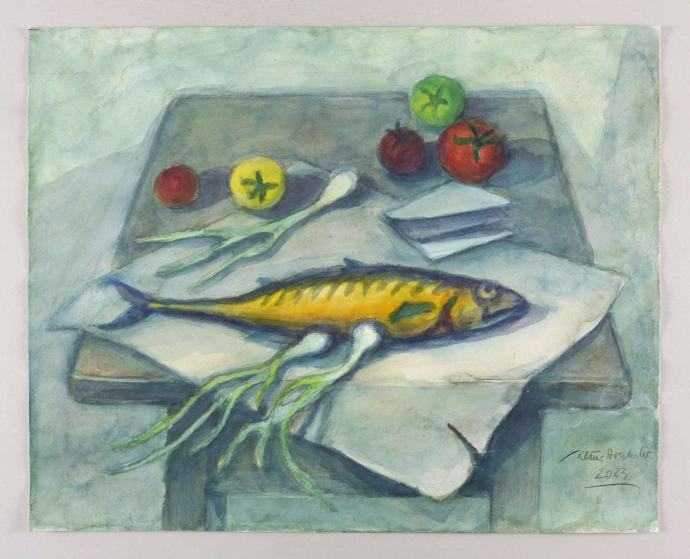 Drechsler, Klaus. – „Abstelltisch mit Räucherfisch”.