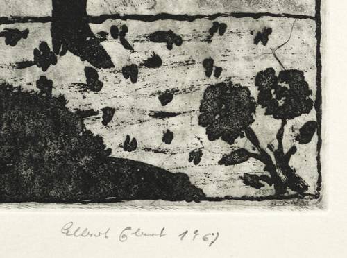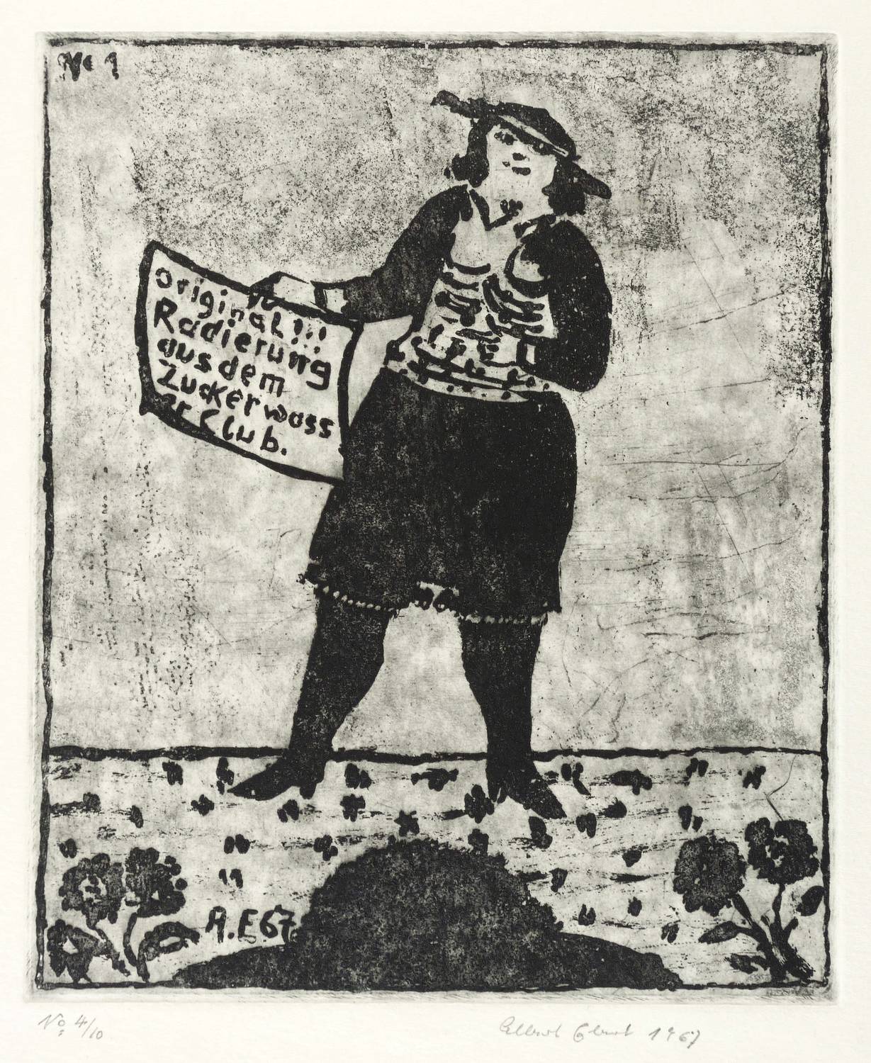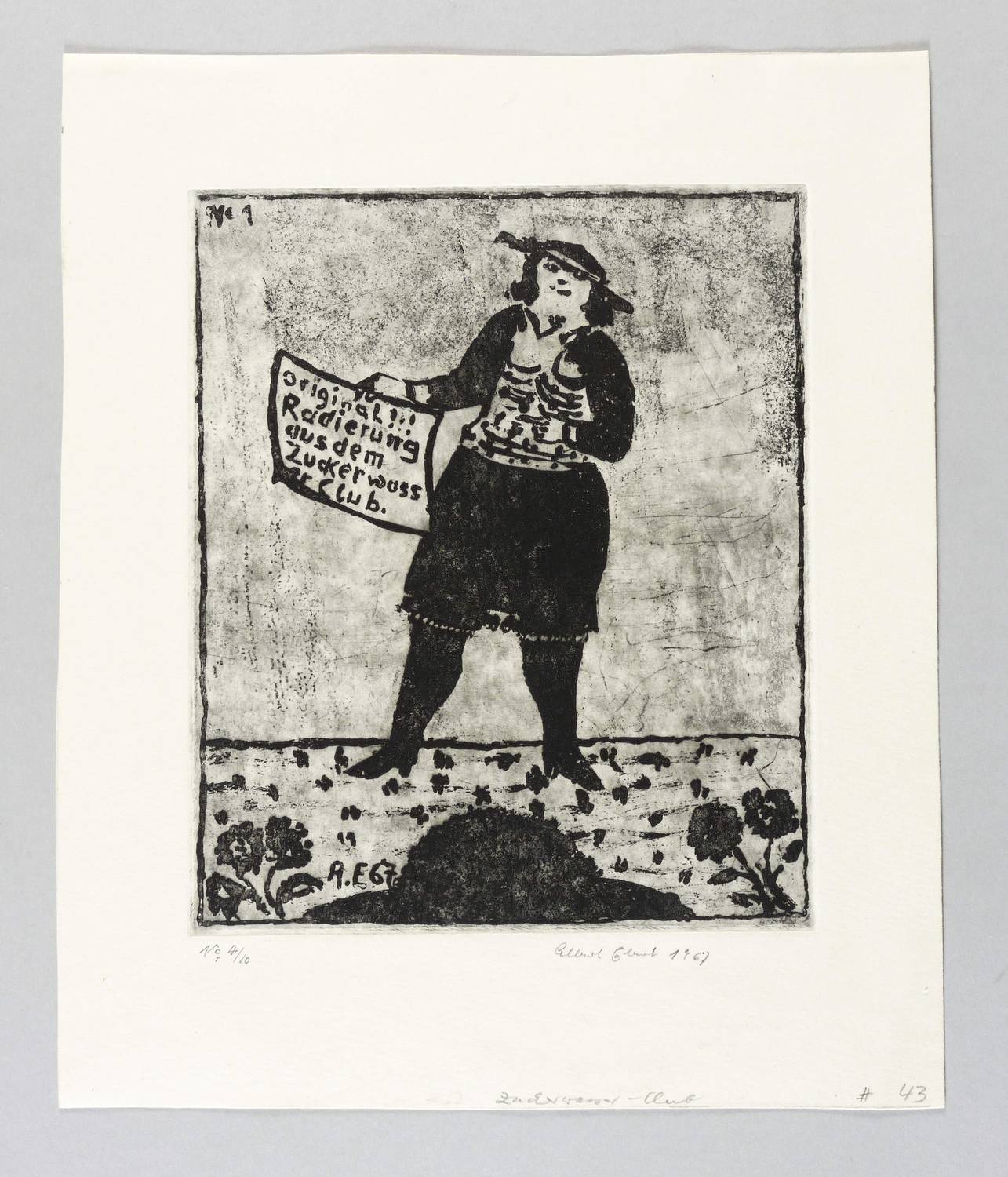 Brade-Stula R 47. – Rechts unten in Bleistift signiert und datiert: ″Albert Ebert 1967″. Rechts eigenhändige Auflagenbezeichnung. In der Platte links unten Signatur und Jahr: ″A.E. 67″. In der Schrifttafel Inschrift: ″Original!!! Radierung aus dem Zuckerwasser Club.″ Rechts oben bezeichnet: ″No. 1″. Am unteren Blattrand von fremder Hand Titel und Sammlungs-Nr. – Seltenes Blatt. - Provenienz: Sammlung Gottfried Müller (1921-2013). 1974-2011 Inhaber der Evangelischen Buchhandlung und Antiquariat Max Müller in Chemnitz (Karl- Marx-Stadt). – Tadellos erhalten. Sehr guter Zustand.