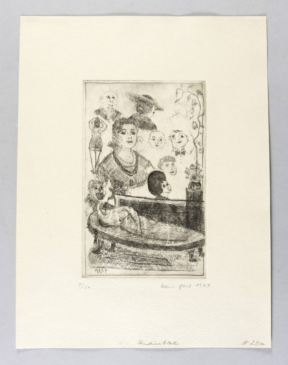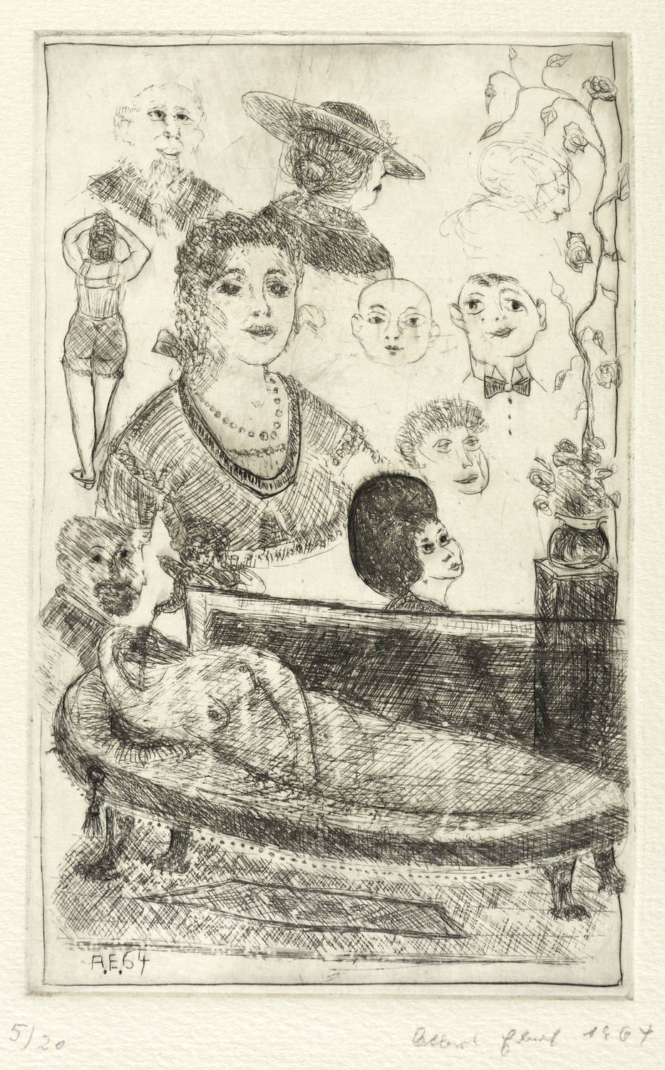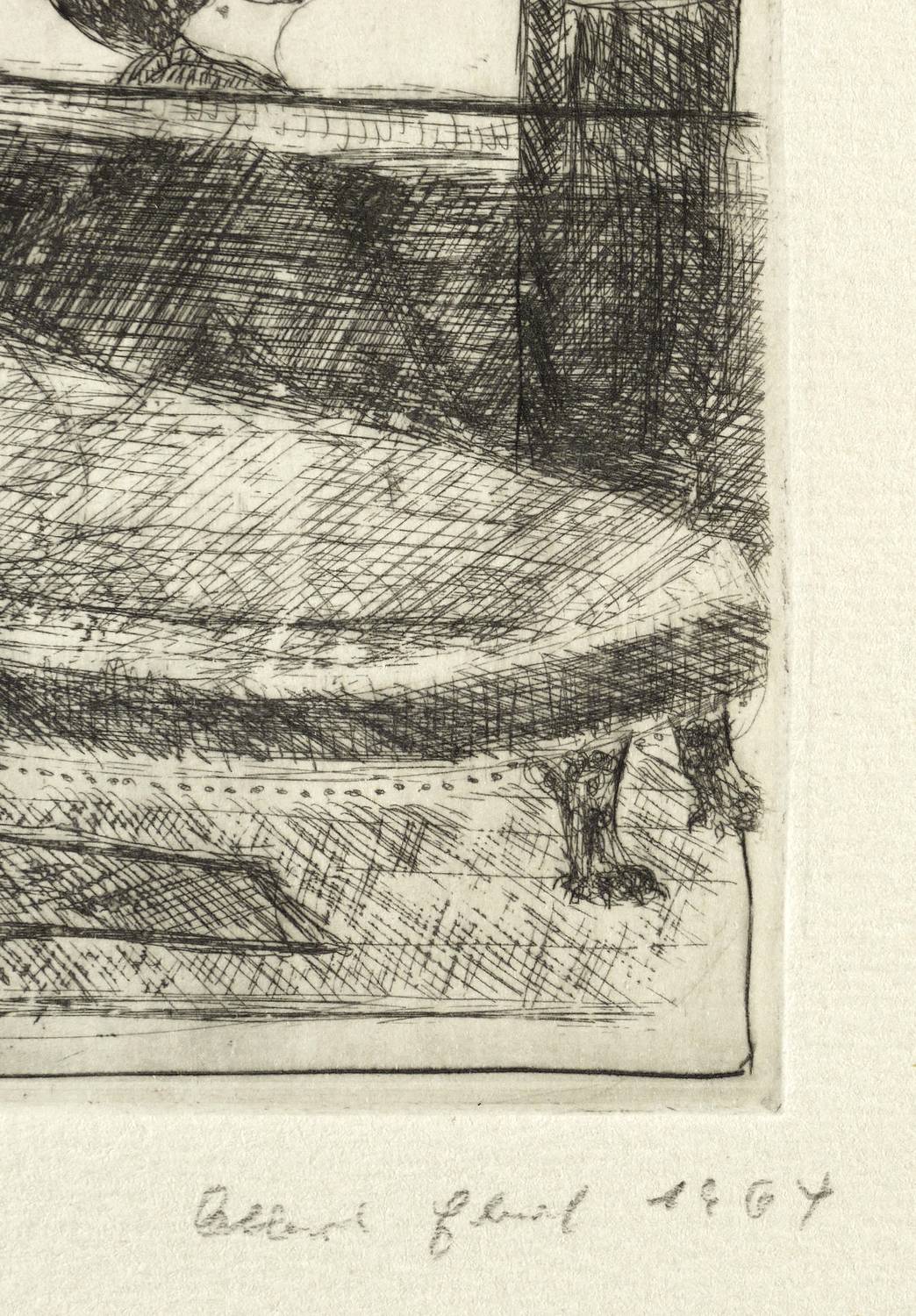 1964. Radierung / Kaltnadel, in Schwarz, auf hartem gehämmertem Maschinenpapier. – Originale Künstlergrafik, von Albert Ebert. – Auflage Exemplar Nr. 5/20. – 19,9 x 12,7 cm (Darstellung / Platte), 34 x 25 cm (Blatt).