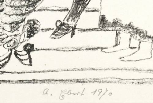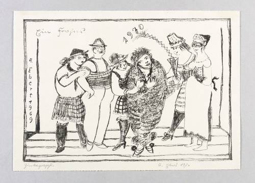 Brade-Stula Z 2. – Rechts unten in Bleistift signiert und datiert: ″A. Ebert 1970″. Links Technikbezeichnung: ″Zinkographie″. In der Platte im linken Rand Signatur und Jahr: ″A. Ebert 1969″. Oben Inschrift: ″Ein Frohes 1970″. – Provenienz: Sammlung Gottfried Müller (1921- 2013). 1974-2011 Inhaber der Evangelischen Buchhandlung und Antiquariat Max Müller in Chemnitz (Karl-Marx-Stadt). – Tadellos erhalten. Sehr guter Zustand.