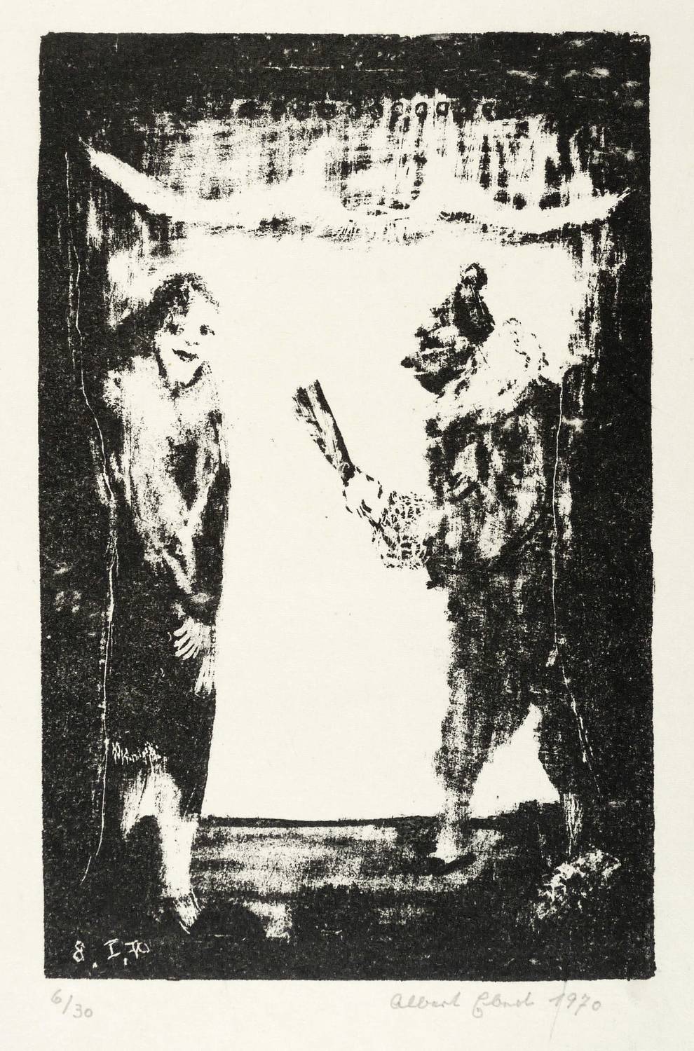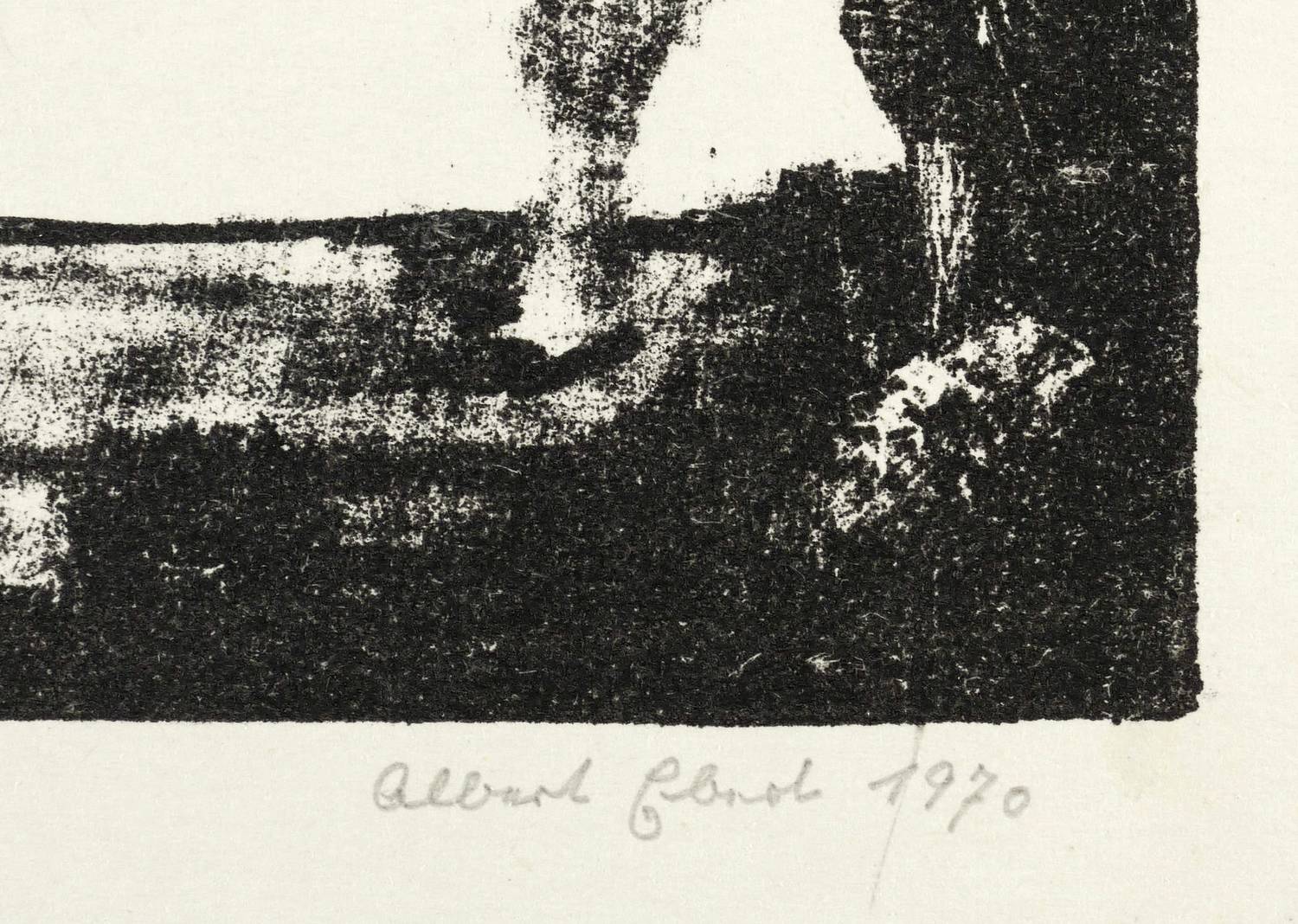 1970. Lithografie / Kreide- & Pinsellithografie, partiell geschabt, in Schwarz, auf glattem hellgelbem Velin. – Originale Künstlergrafik, von Albert Ebert. – Auflage Exemplar Nr. 6/30. – 16,8 x 10,8 cm (Darstellung / Druckbild), 25 x 18 cm (Blatt).
