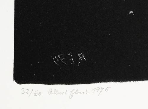 1974. Lithografie / Pinsellithografie, partiell gewischt & geschabt, in Schwarz, auf Velinkarton. – Originale Künstlergrafik, von Albert Ebert. – Auflage Exemplar Nr. 32/60. – 17,9 x 16,2 cm (Darstellung / Druckbild), 24 x 20 cm (Blatt).