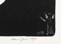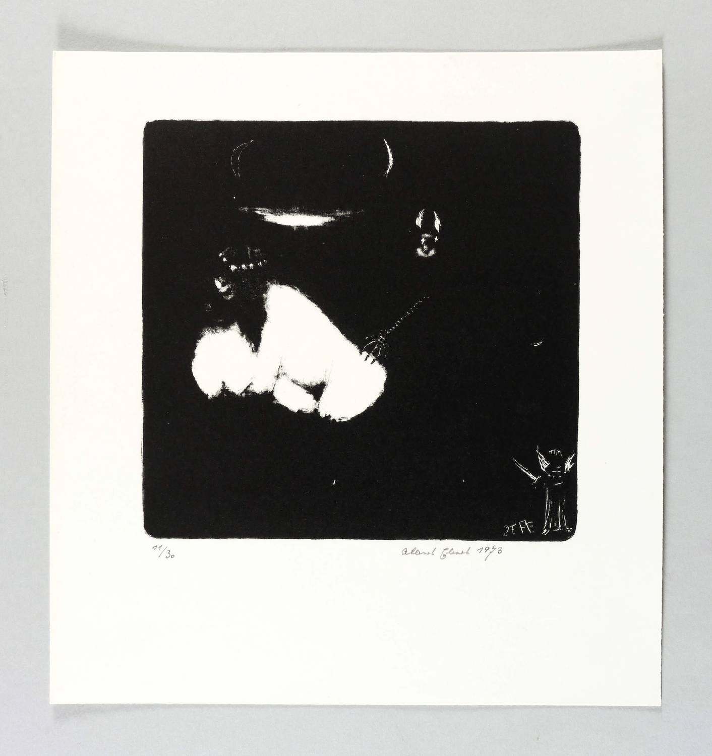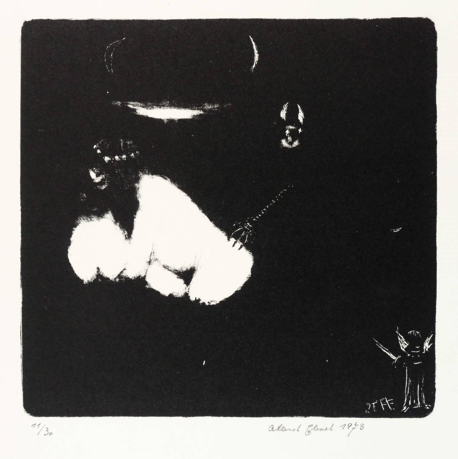 1973. Lithografie / Pinsellithografie, partiell gewischt & geschabt, in Schwarz, auf glattem Velinkarton. – Originale Künstlergrafik, von Albert Ebert. – Auflage Exemplar Nr. 11/30. – 15,4 x 16,0 cm (Darstellung / Druckbild), 24 x 23 cm (Blatt).