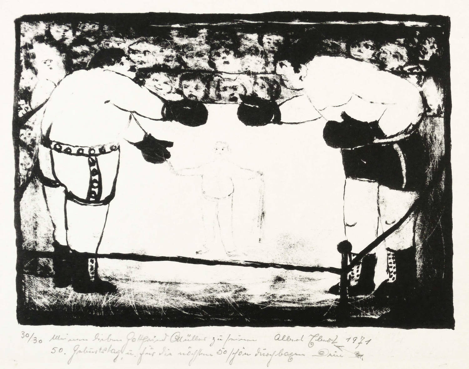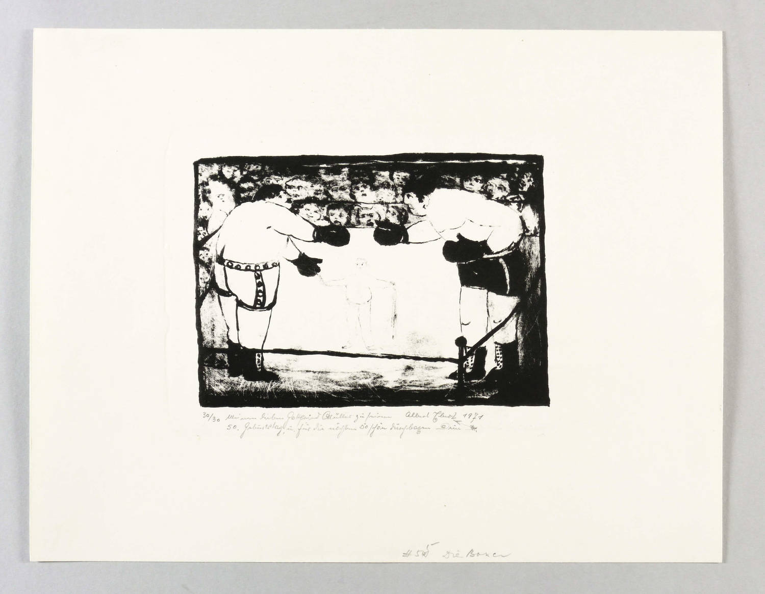 Brade-Stula L 60. – Rechts unten in Bleistift signiert und datiert: ″Albert Ebert 1971″. Links eigenhändige Auflagenbezeichnung. Dazu Widmung: ″Meinem lieben Gottfried Müller zu seinem 50. Geburtstag u. für die nächsten 50 schön durchboxen. Dein″. Am unteren Blattrand von fremder Hand Sammlungs- Nr. und Titel. – Provenienz: Sammlung Gottfried Müller (1921- 2013). 1974-2011 Inhaber der Evangelischen Buchhandlung und Antiquariat Max Müller in Chemnitz (Karl-Marx-Stadt). – Tadellos erhalten. Sehr guter Zustand.