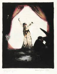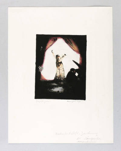 Brade-Stula L 70. – Rechts unten in Bleistift signiert und datiert: ″Albert Ebert 1972″. Links eigenhändig Titel. Am unteren Blattrand von fremder Hand bezeichnet: ″Wachsfarbstift-Zeichnung / #1 Sängerin / Schlagersängerin″ – Verso weitere in Wachs ankolorierte Lithografie ″In Erwartung des Bräutigams″ (WVZ Brade-Stula L 71). - Eberts Drucker Helmut Brade schildert die Entstehung der Wachsmalerei über Lithografie so: ″… und es entstanden in einem Zug im Winter 1972 gegen 100 außergewöhnlich schön kolorierte Blätter. Er arbeitete mit Wachsmalstiften, einem ganz einfachen Sortiment für Kinder. Nur gelegentlich nahm er etwas Deckweiß zu Hilfe. Das Wachs, dick aufgetragen und poliert, war wieder ein Material, das er liebte und das es ihm gestattete, eine wertvolle Bildoberfläche zu schaffen.″ (siehe WVZ Brade-Stula, S. 53). - Provenienz: Sammlung Gottfried Müller (1921-2013). 1974-2011 Inhaber der Evangelischen Buchhandlung und Antiquariat Max Müller in Chemnitz (Karl-Marx-Stadt). – Tadellos erhalten. Sehr guter Zustand.