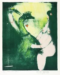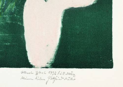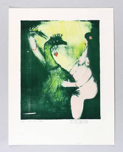 Brade-Stula L 72. – Rechts unten in Bleistift signiert und datiert: ″Albert Ebert 1972 / 28 März″. Dazu Widmung: ″Meinem leiben Gottfried Müller″. Links eigenhändige Auflagenbezeichnung und Titel. Im Stein links unten teilweise spiegelverkehrt Signatur und Jahr: ″A. Ebert 1972″. Am unteren Blattrand von fremder Hand Sammlungs-Nr. – Zur Operette ″Die schöne Helena″ von Peter Hacks. - Eberts Drucker Helmut Brade schildert die Entstehung der Wachsmalerei über Lithografie so: ″… und es entstanden in einem Zug im Winter 1972 gegen 100 außergewöhnlich schön kolorierte Blätter. Er arbeitete mit Wachsmalstiften, einem ganz einfachen Sortiment für Kinder. Nur gelegentlich nahm er etwas Deckweiß zu Hilfe. Das Wachs, dick aufgetragen und poliert, war wieder ein Material, das er liebte und das es ihm gestattete, eine wertvolle Bildoberfläche zu schaffen.″ (siehe WVZ Brade-Stula, S. 53). - Provenienz: Sammlung Gottfried Müller (1921-2013). 1974-2011 Inhaber der Evangelischen Buchhandlung und Antiquariat Max Müller in Chemnitz (Karl-Marx-Stadt). – Tadellos erhalten. Sehr guter Zustand.