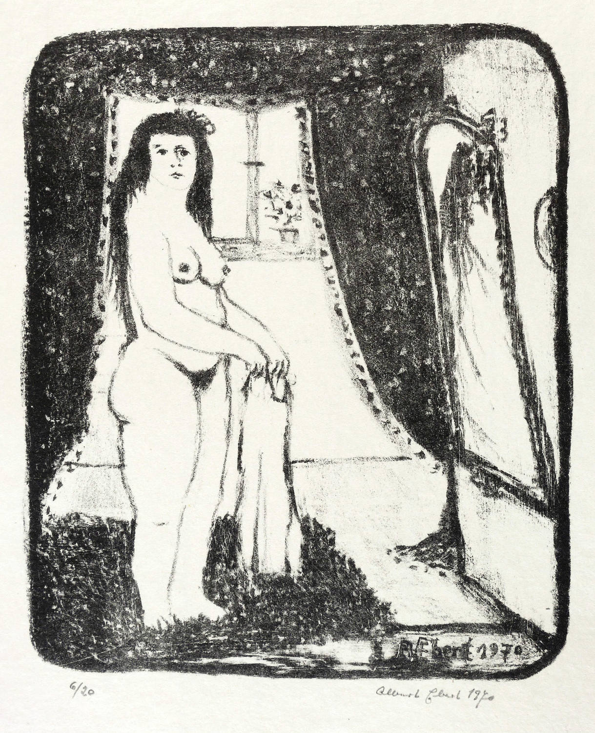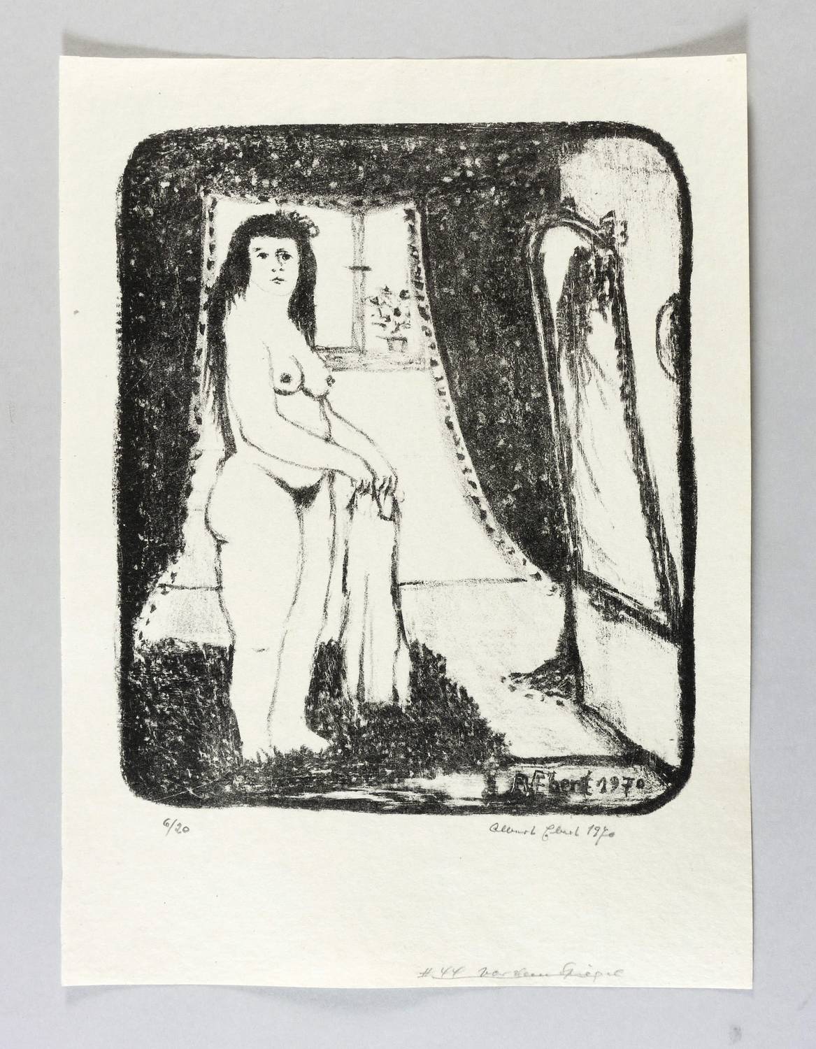 Brade-Stula L 51. – Rechts unten in Bleistift signiert und datiert: ″Albert Ebert 1970″. Links Auflagenbezeichnung. Im Stein rechts unten Signatur und Jahr: ″A. Ebert 1970″. Am unteren Blattrand rechts von fremder Hand Sammlungs-Nr. und abweichender gestrichener Titel: ″Vor dem Spiegel″. – Provenienz: Sammlung Gottfried Müller (1921- 2013). 1974-2011 Inhaber der Evangelischen Buchhandlung und Antiquariat Max Müller in Chemnitz (Karl-Marx-Stadt). – Sehr guter Zustand. Tadellos.