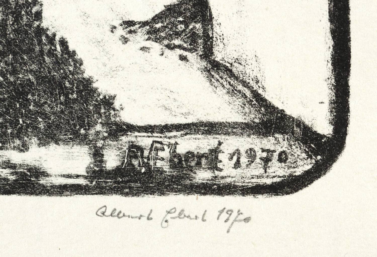 1970. Lithografie / Kreidelithografie, in Schwarz, auf glattem hellgelbem Maschinenbütten. – Originale Künstlergrafik, von Albert Ebert. – Auflage Exemplar Nr. 6/20. – 21,8 x 18,3 cm (Darstellung / Druckbild), 29 x 22 cm (Blatt).