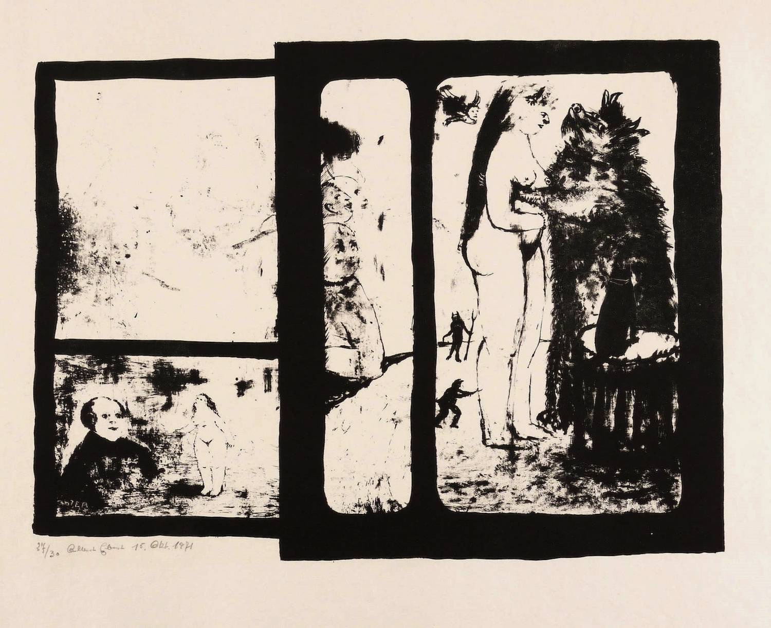 1970/1971. Lithografie / Pinsellithografie, partiell geschabt, in Schwarz, auf festem glattem Velinkarton. – Originale Künstlergrafik, von Albert Ebert. – Auflage Exemplar Nr. 27/30. – 30,6 x 40,7 cm (Darstellung / Druckbild), 50 x 60 cm (Blatt).