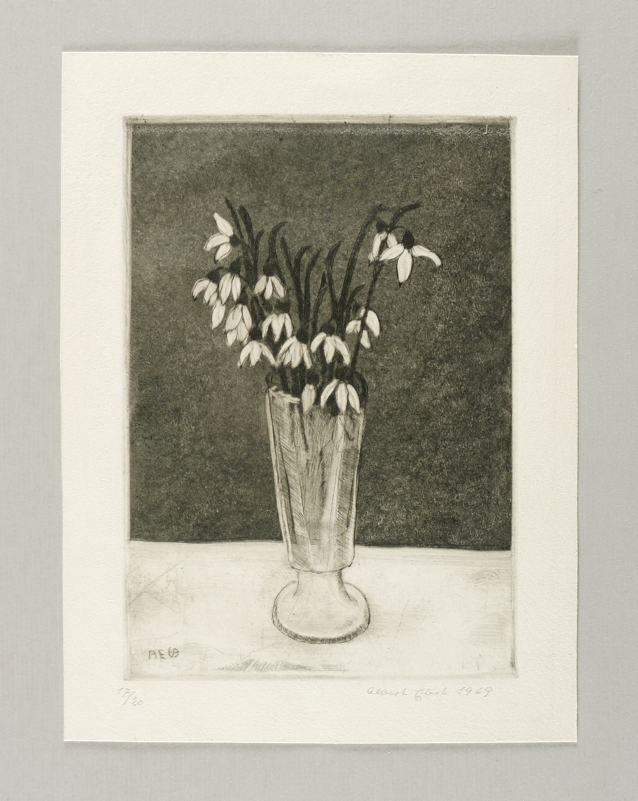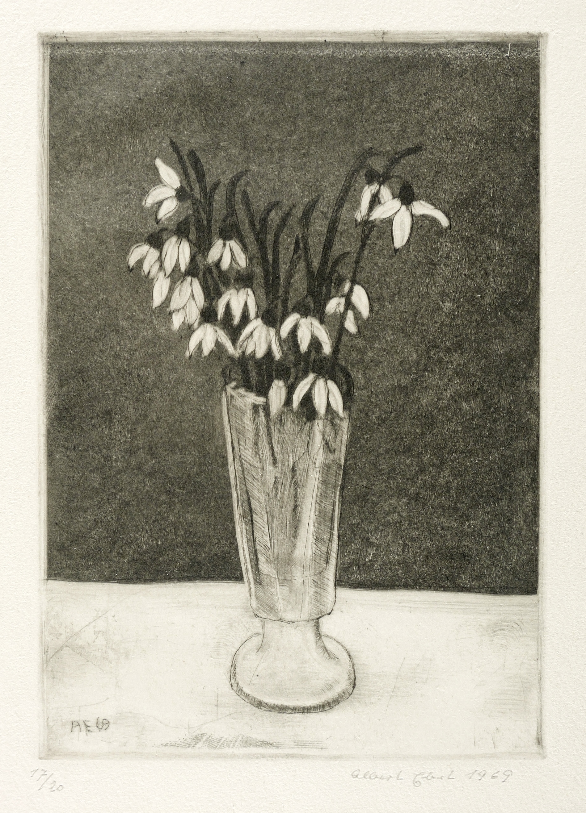 Brade-Stula R 49. – Rechts unten in Bleistift signiert und datiert: ″Albert Ebert 1969″. Links eigenhändige Auflagenbezeichnung: ″17/20″. In der Platte links unten Monogramm und Jahr: ″AE 69″. – Abzug aus der Auflage von dem attraktiven zweiten Zustand der Platte mit dem in Aquatinta behandelten Hintergrund. – Ohne Mängel. Sehr guter Zustand.