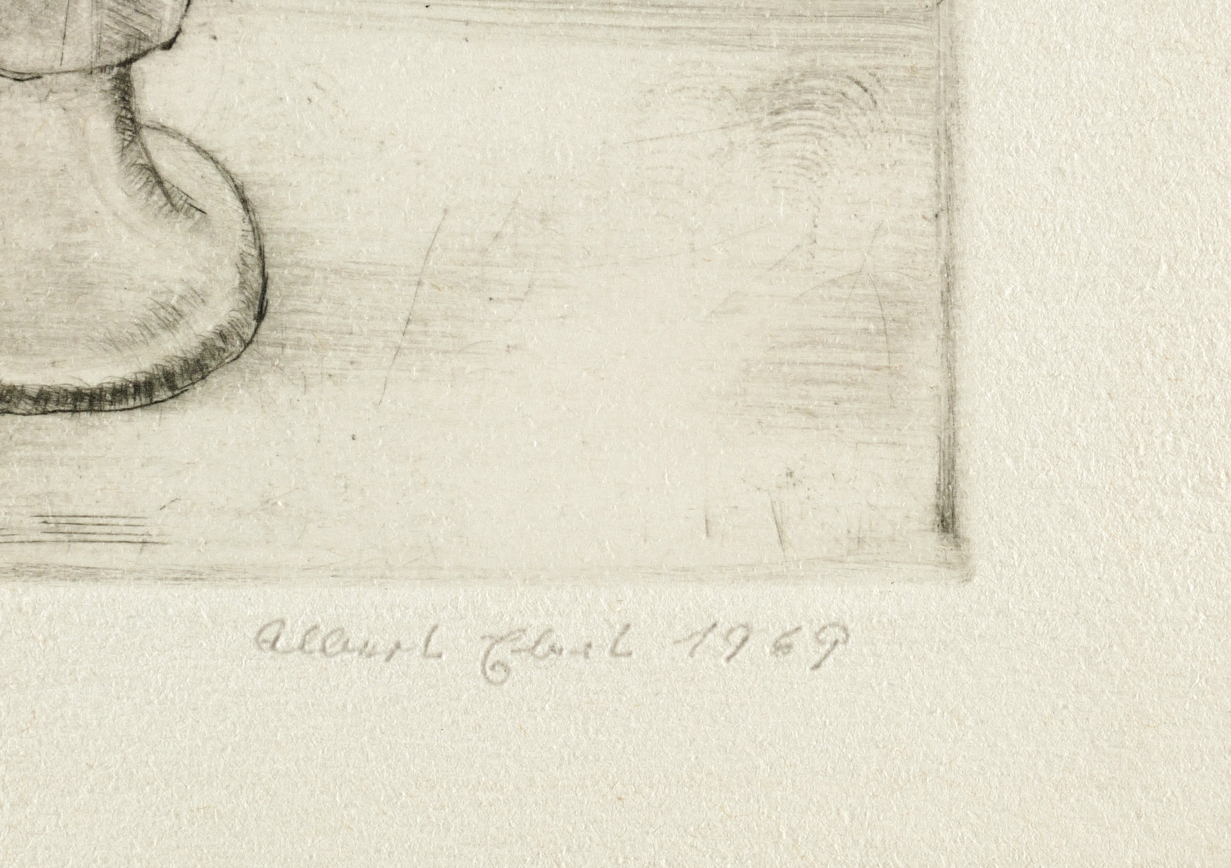 1969. Radierung / Kaltnadel & Aquatinta, partiell geschliffen, in Schwarz, auf chamois Velinkarton. – Originale Künstlergrafik, von Albert Ebert. – Auflage Exemplar Nr. 17/20. – 19,7 x 13,8 cm (Darstellung / Platte), 25 x 18 cm (Blatt).