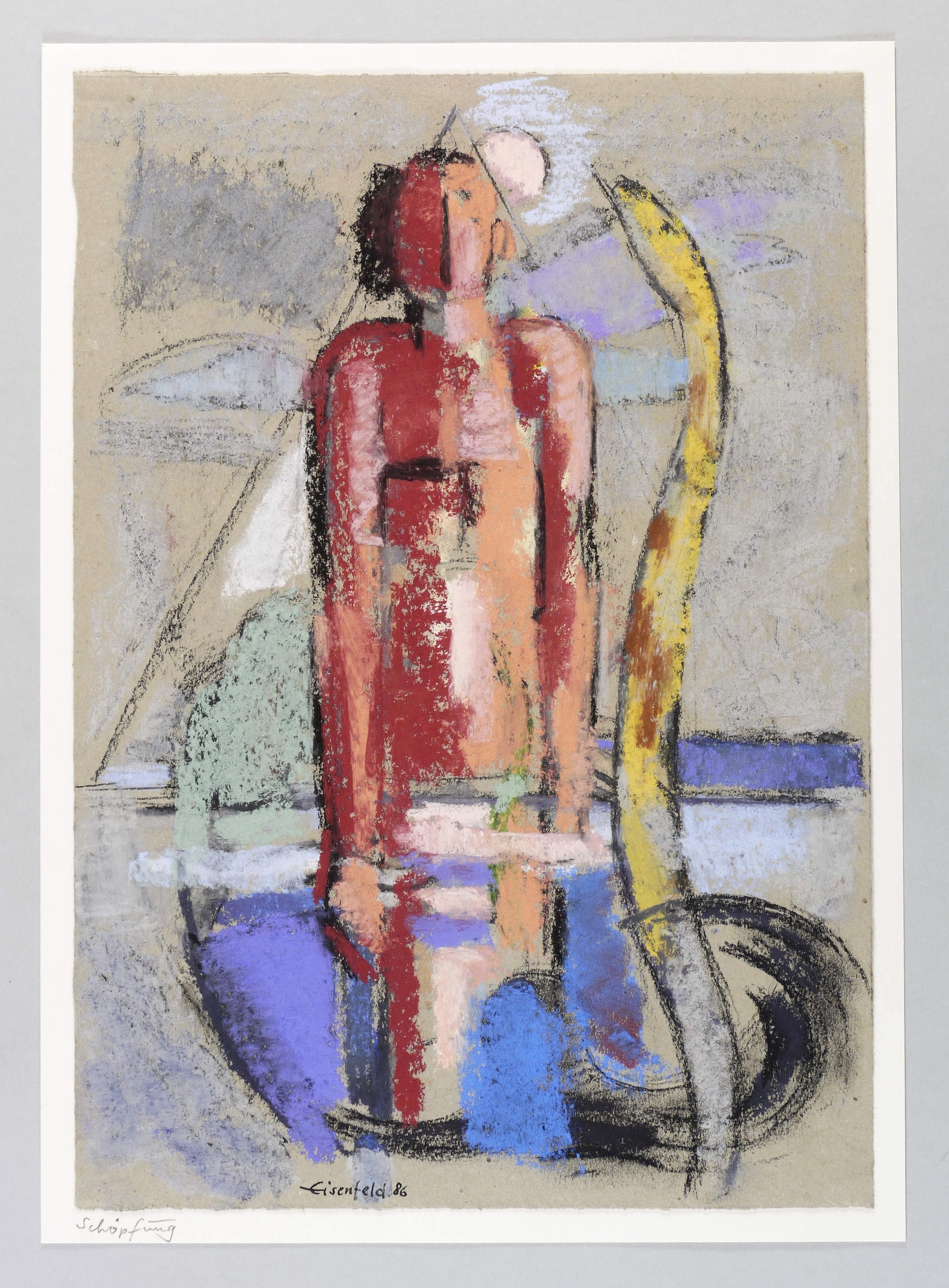 1986. Pastellkreide, mit Plakatfarbe, auf grauem Karton. – Originale Künstlergrafik, von Ulrich Eisenfeld. – 41,0 x 28,5 cm (Darstellung / Blatt).
