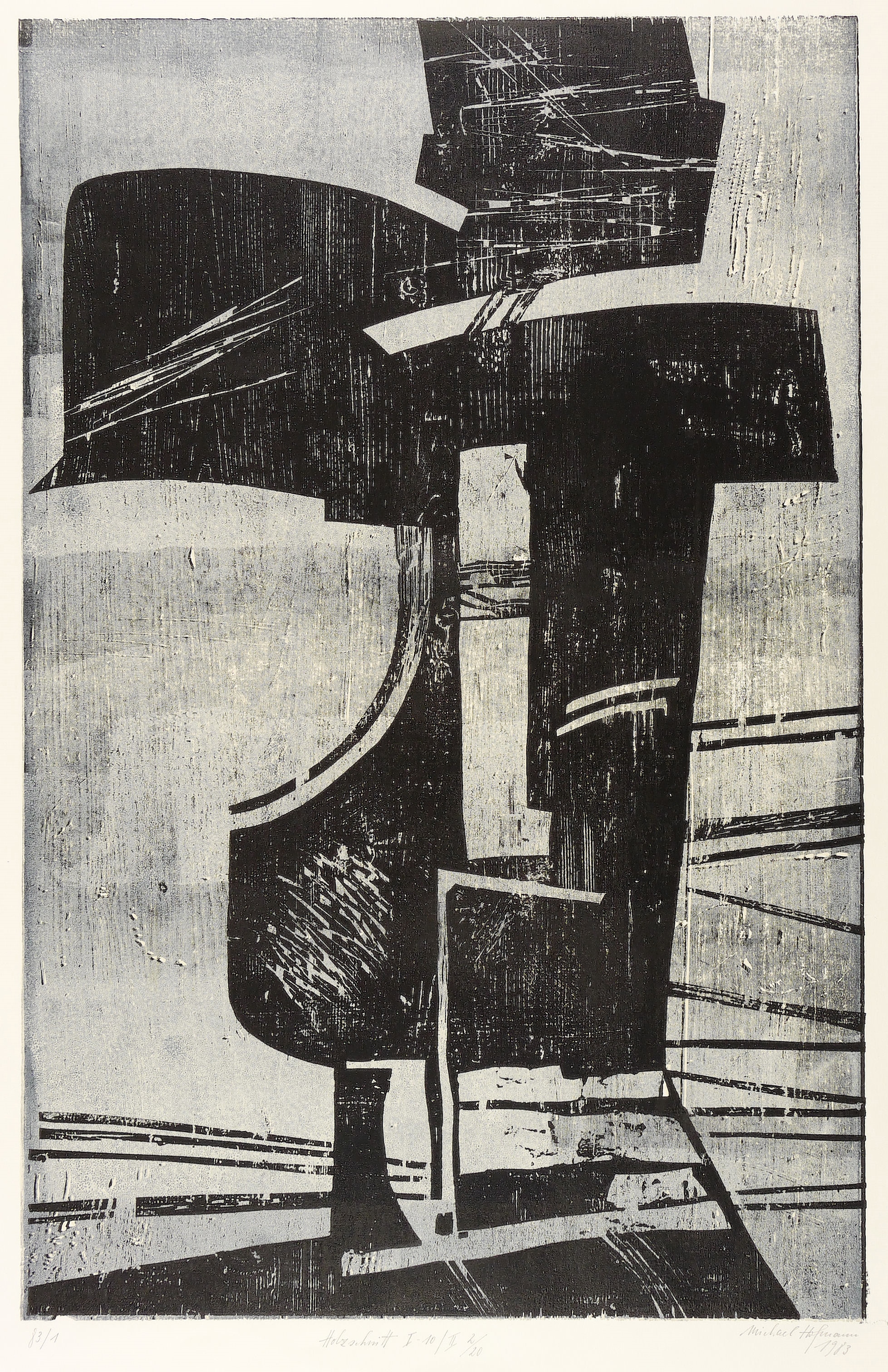 1983. Farbolzschnitt, in Grau und Schwarz, auf Weißenborn-Bütten. – Originale Künstlergrafik, von Michael Hofmann. – Auflage Exemplar Nr. 2/20. – 75,0 x 48,7 cm (Darstellung / Druckstock), 83 x 57 cm (Blatt).