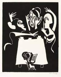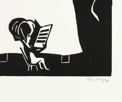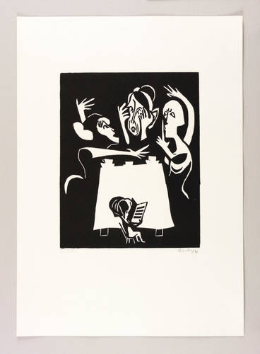 1948. Holzschnitt, in Schwarz, auf genarbtem hellchamois Velin. – Originale Künstlergrafik, von Herbert Sandberg. – Auflage Exemplar Nr. 26/50. – 30,3 x 24,2 cm (Darstellung / Druckstock), 55 x 39 cm (Blatt).