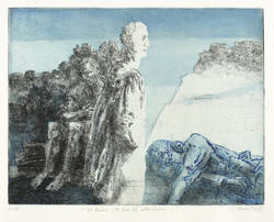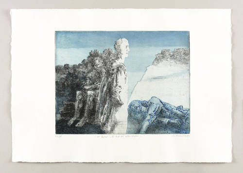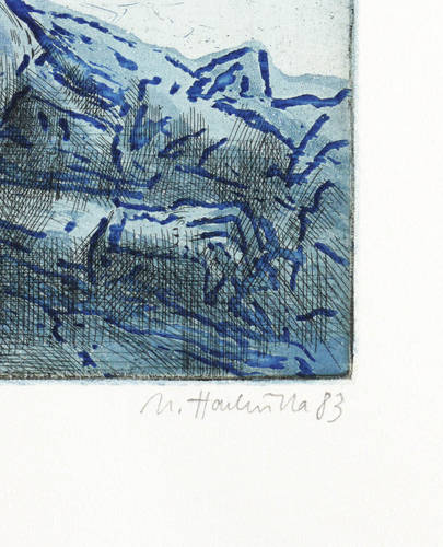 1983. Farbradierung / Aquatinta & Strichätzung, in Blau & Schwarz, auf schwerem helchamois Bütten. – Von Ulrich Hachulla. – Auflage Exemplar Nr. 26/50. – 26,8 x 34,8 cm (Darstellung / Platte), 40 x 57 cm (Blatt).